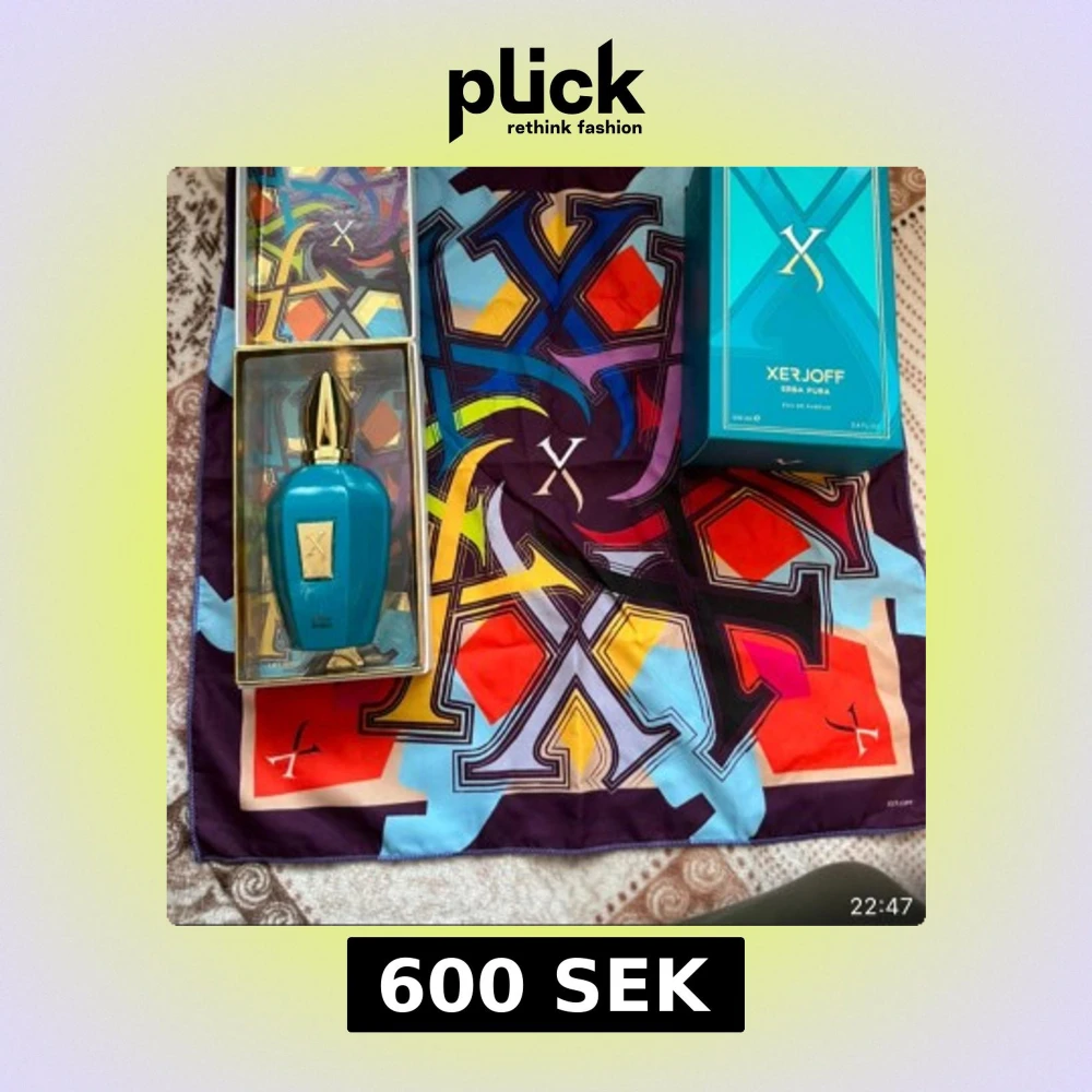 Lyxig parfym från Xerjoff, Erba Pura, i en snygg turkosblå flaska med gulddetaljer och exklusiv design. Flaskan har en unik form och levereras i en färgstark box med matchande mönstrad scarf. Volymen är 100 ml Eau de Parfum.