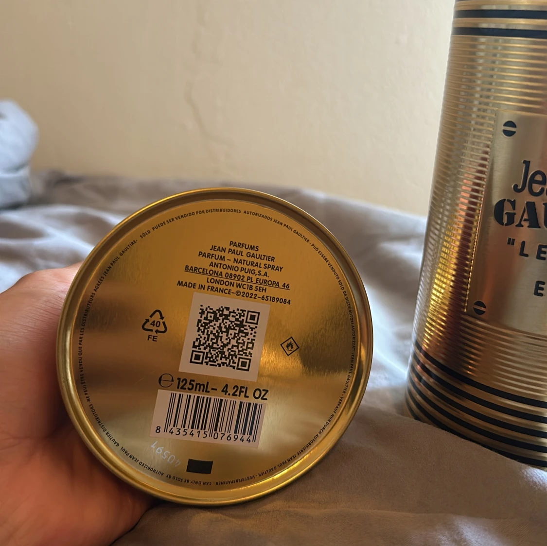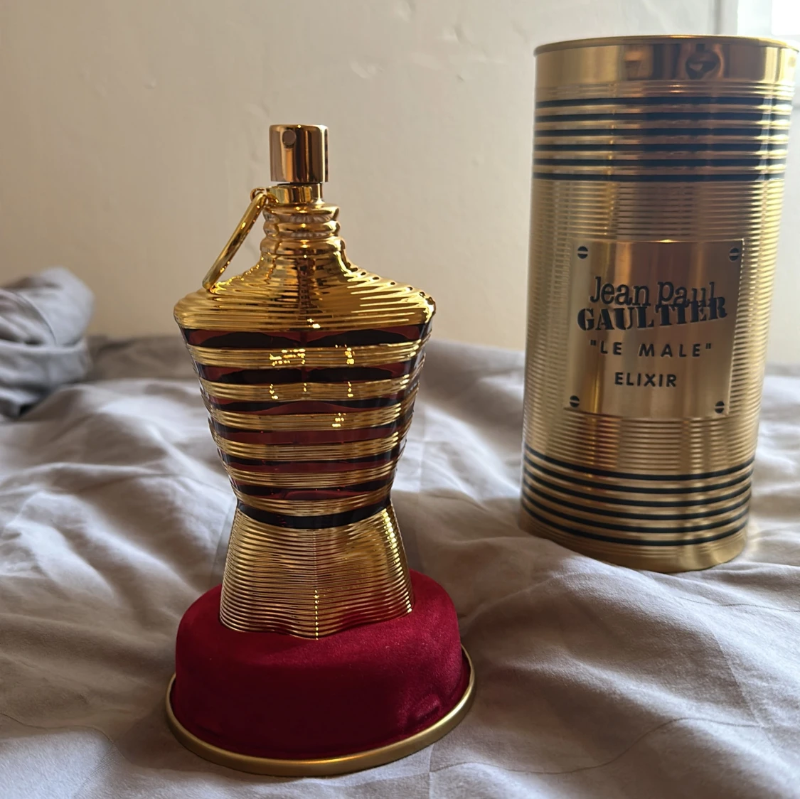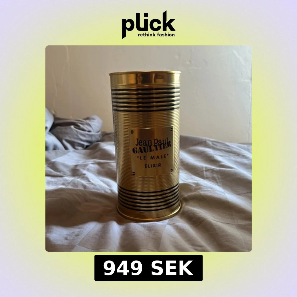Jean Paul Gaultier Le Male Elixir EdP i en ikonisk guld- och svart randig metallburk. Flaskan är formad som en manlig torso i guld med svarta ränder och står på en röd sammetsliknande bas. Volymen är 125 ml. En lyxig och unik parfymflaska som sticker ut i samlingen.