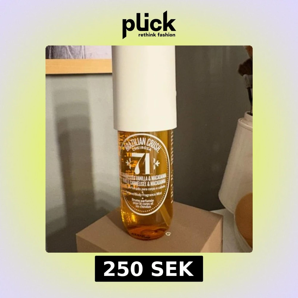 En söt och varm doftmist från Sol de Janeiro med toner av karamelliserad vanilj och macadamia. Flaskan är genomskinlig med gyllene vätska och har en stor vit kork. Perfekt för både hår och kropp.