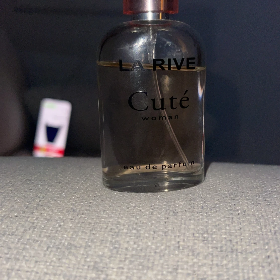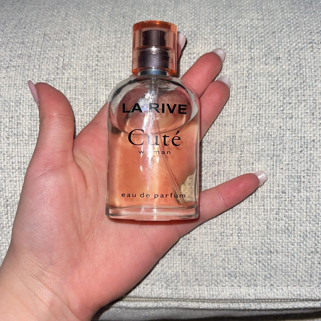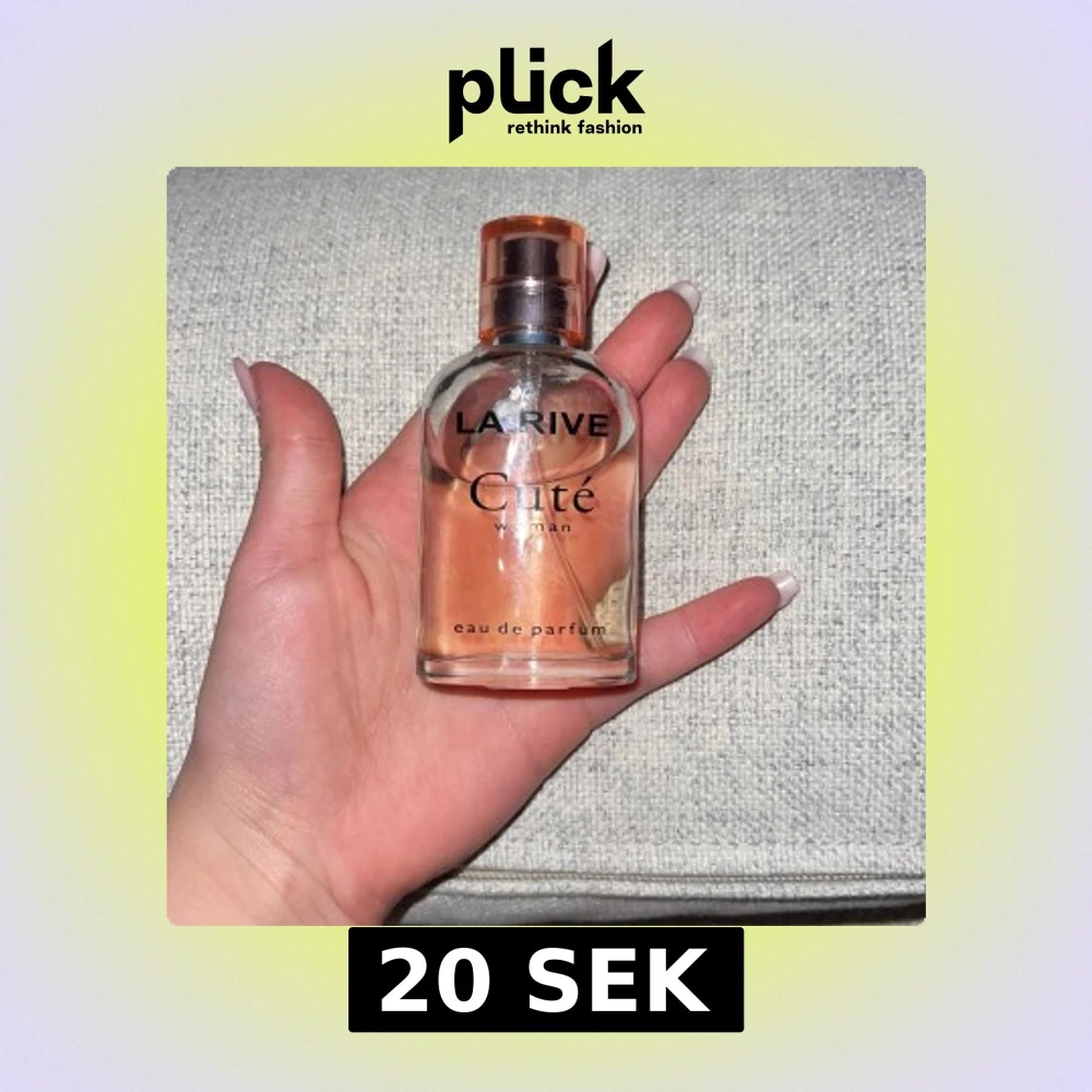 Säljer en elegant flaska av La Rive Cuté Woman Eau de Parfum. Flaskan är genomskinlig med en ljusrosa ton och har en stilren design med en roséguldfärgad kork. Perfekt för den som söker en feminin och fräsch doft.