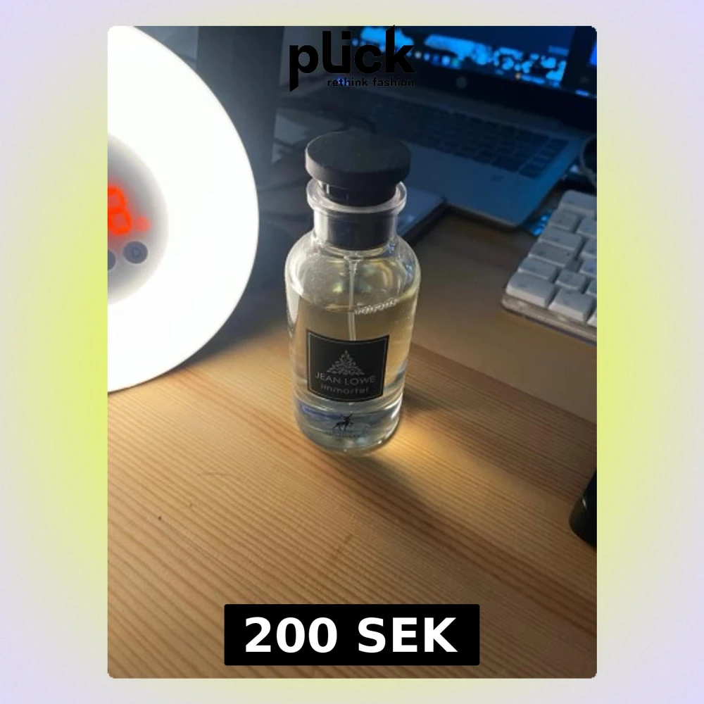 Stilren parfymflaska från Jean Lowe med svart lock och genomskinligt glas. Flaskan har en modern, minimalistisk design och etikett med texten 'Immortel'. Perfekt för dig som gillar eleganta och tidlösa dofter.