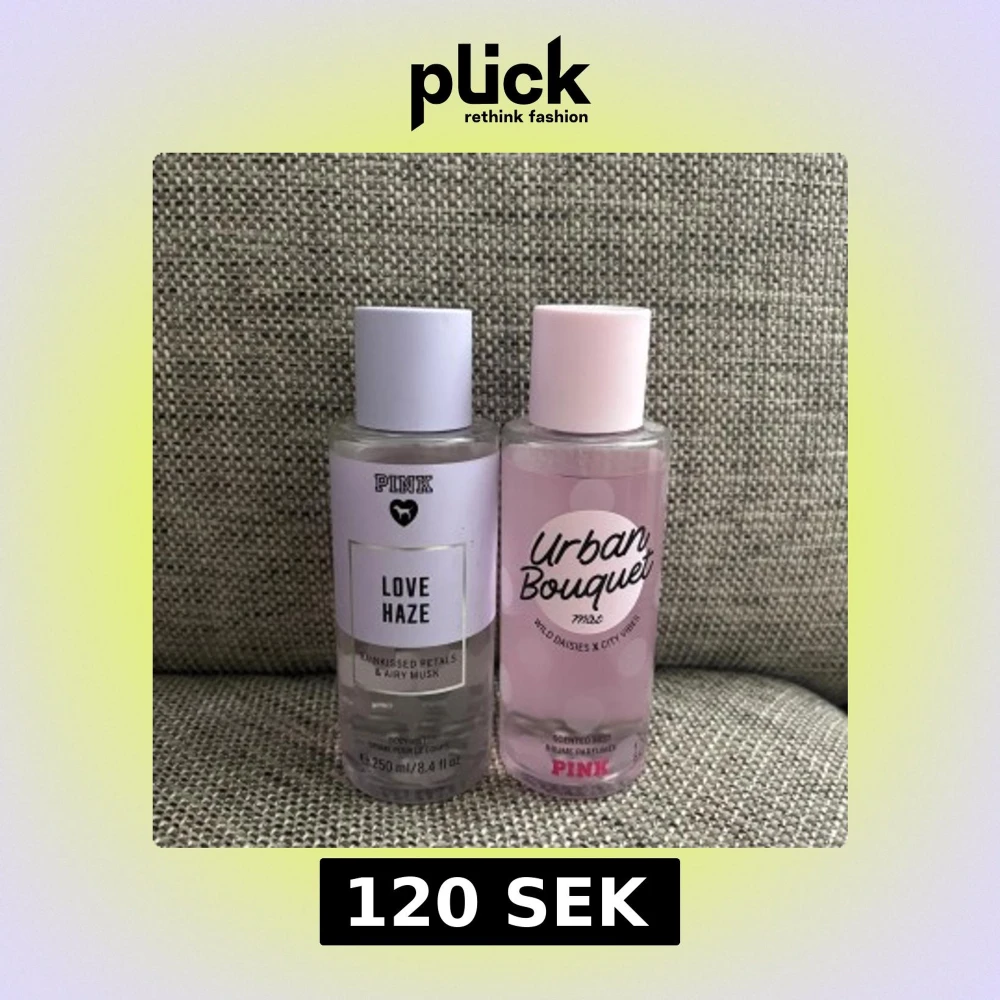 Två fräscha body mists från PINK: Love Haze med regnvåta blomblad och luftig mysk, samt Urban Bouquet med vilda prästkragar och city vibes. Båda i genomskinliga plastflaskor, en med lila och en med rosa detaljer. Volym 250 ml per flaska.