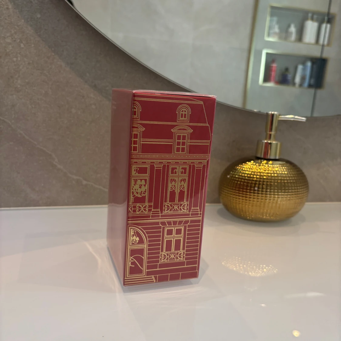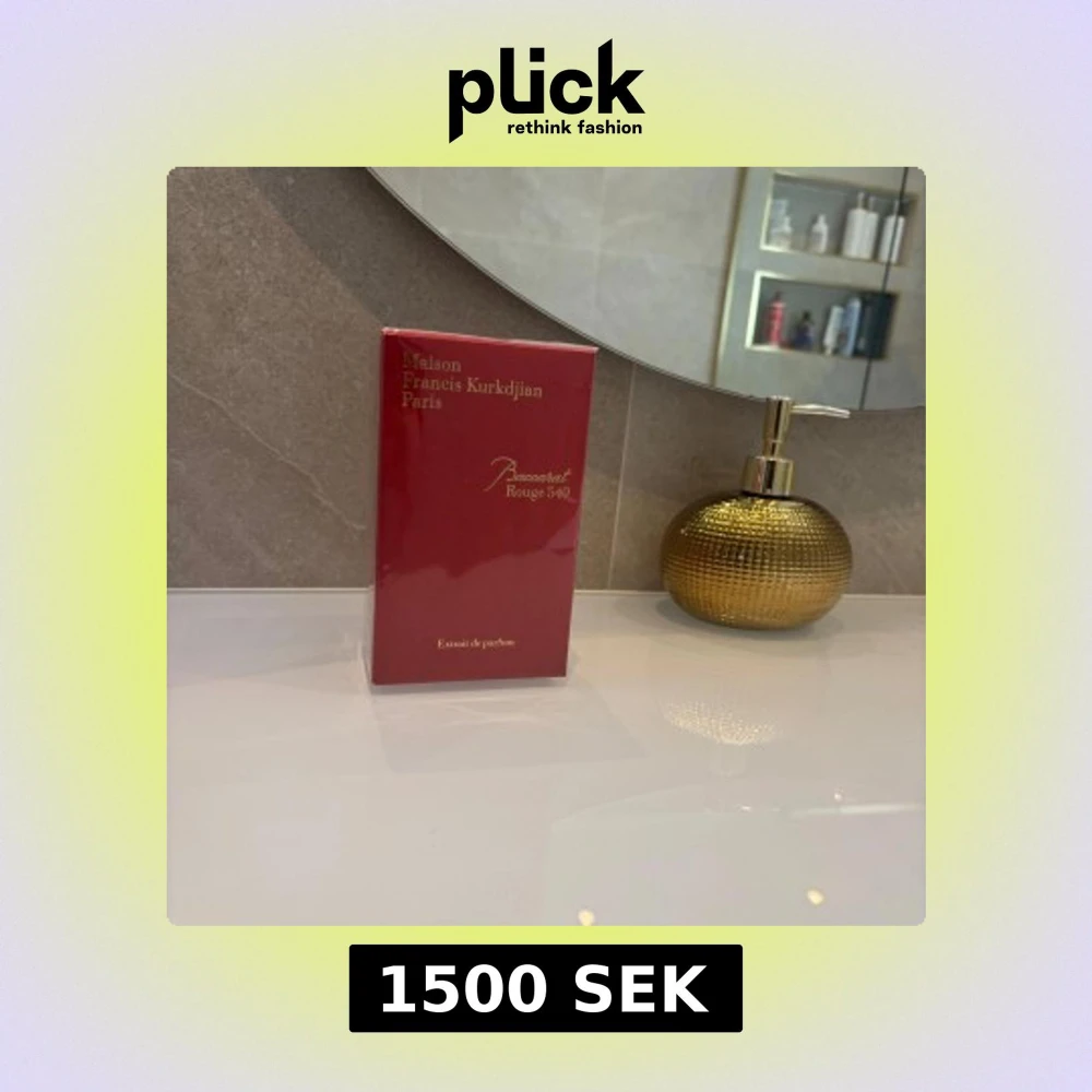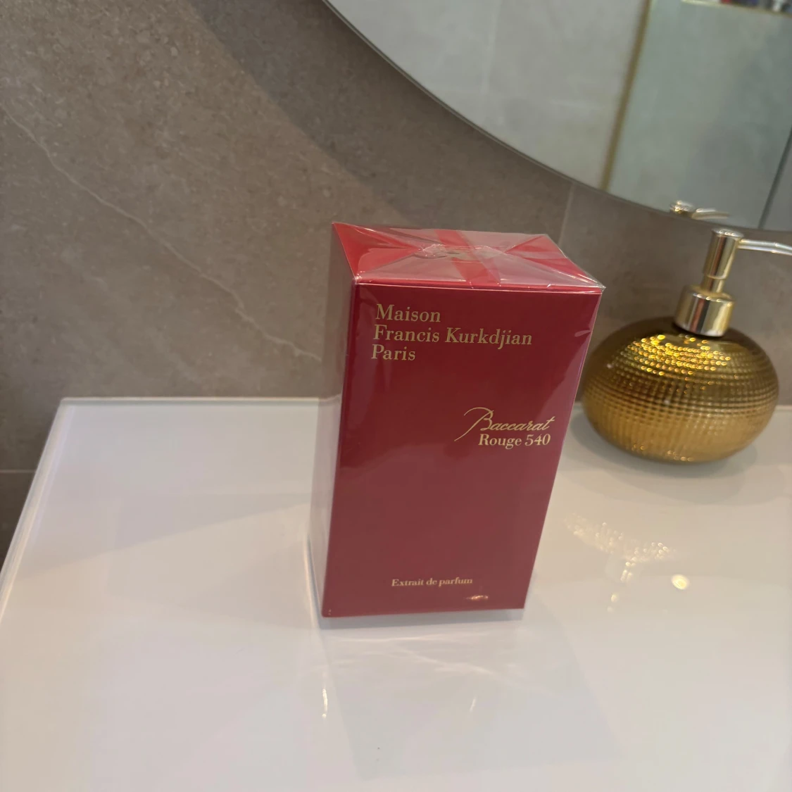 Lyxig parfym i röd och guld förpackning från Maison Francis Kurkdjian, Baccarat Rouge 540 Extrait de Parfum. Kartongen har elegant gulddetaljer och illustration av en byggnad på sidan. Perfekt för dig som vill ha en exklusiv doftupplevelse. Inget kvitto helt nytt