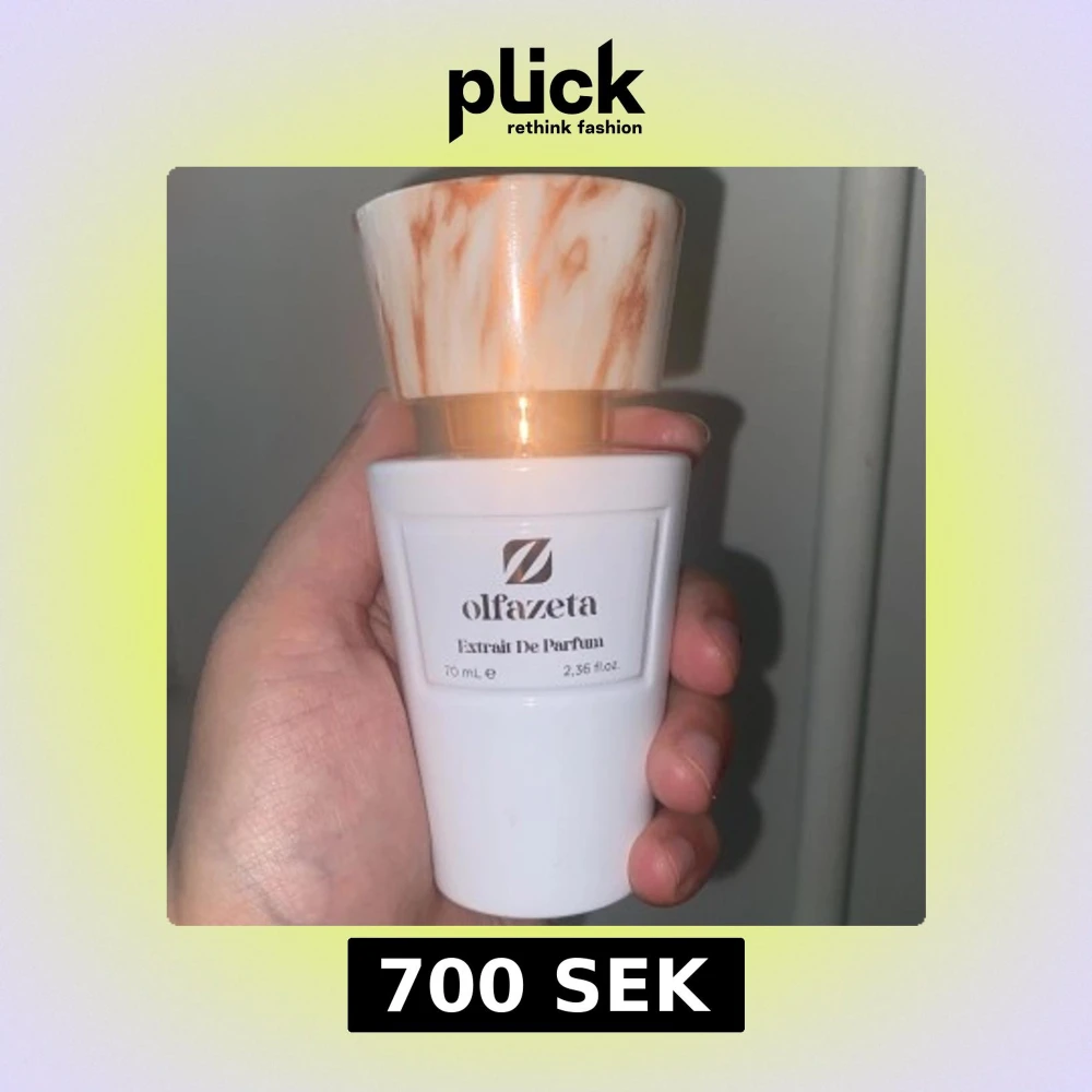 Snygg parfymflaska från Olfazeta, Extrait De Parfum, 70 ml. Flaskan är vit med en unik kork i beige och bruna marmorerade toner. Modern och stilren design som sticker ut i parfymhyllan. Perfekt för dig som gillar exklusiva dofter och snygga detaljer.