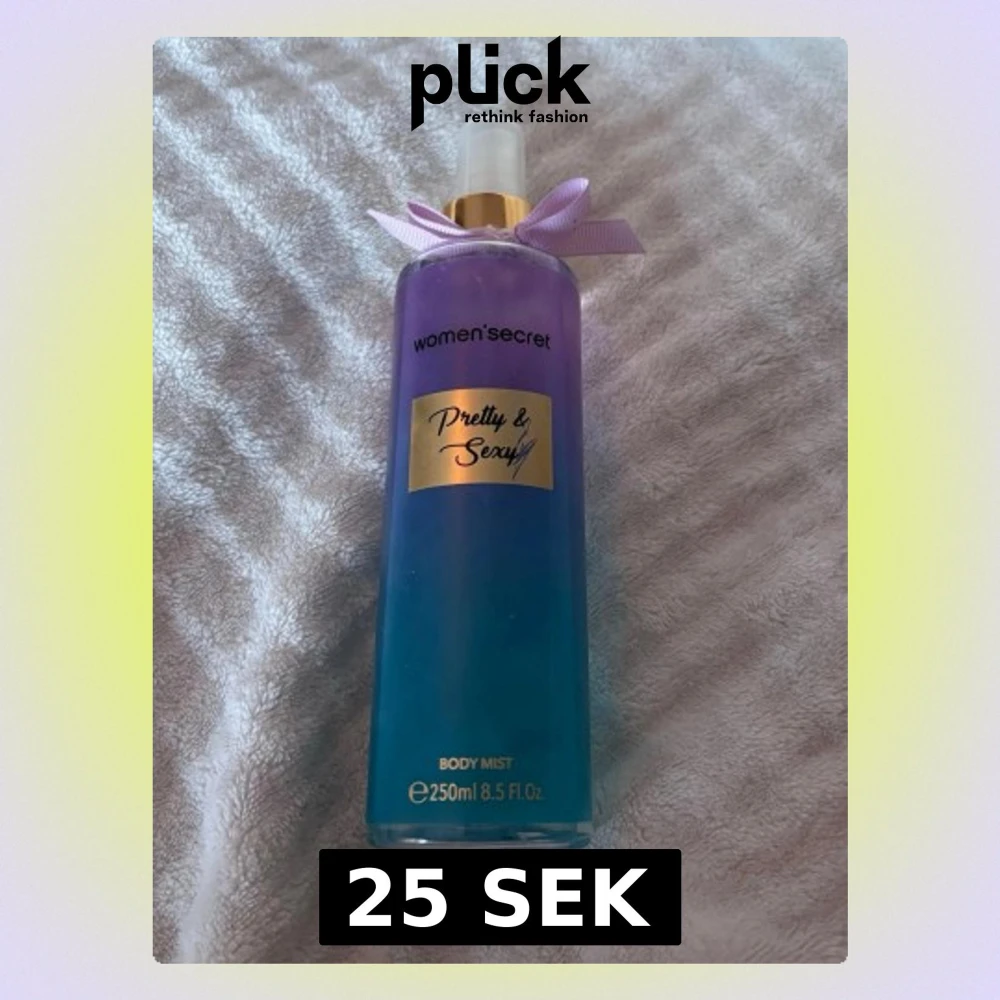 Body mist från Women'secret i doften Pretty & Sexy. Flaskan är i plast med snygg ombre-effekt i lila och blått, dekorerad med en liten lila rosett och gulddetaljer. Rymmer 250 ml och har sprayfunktion för enkel applicering. Mer än hälften kvar! Se sista bilden för att se exakt hur mycket det är kvar! Tack!💓🌸
