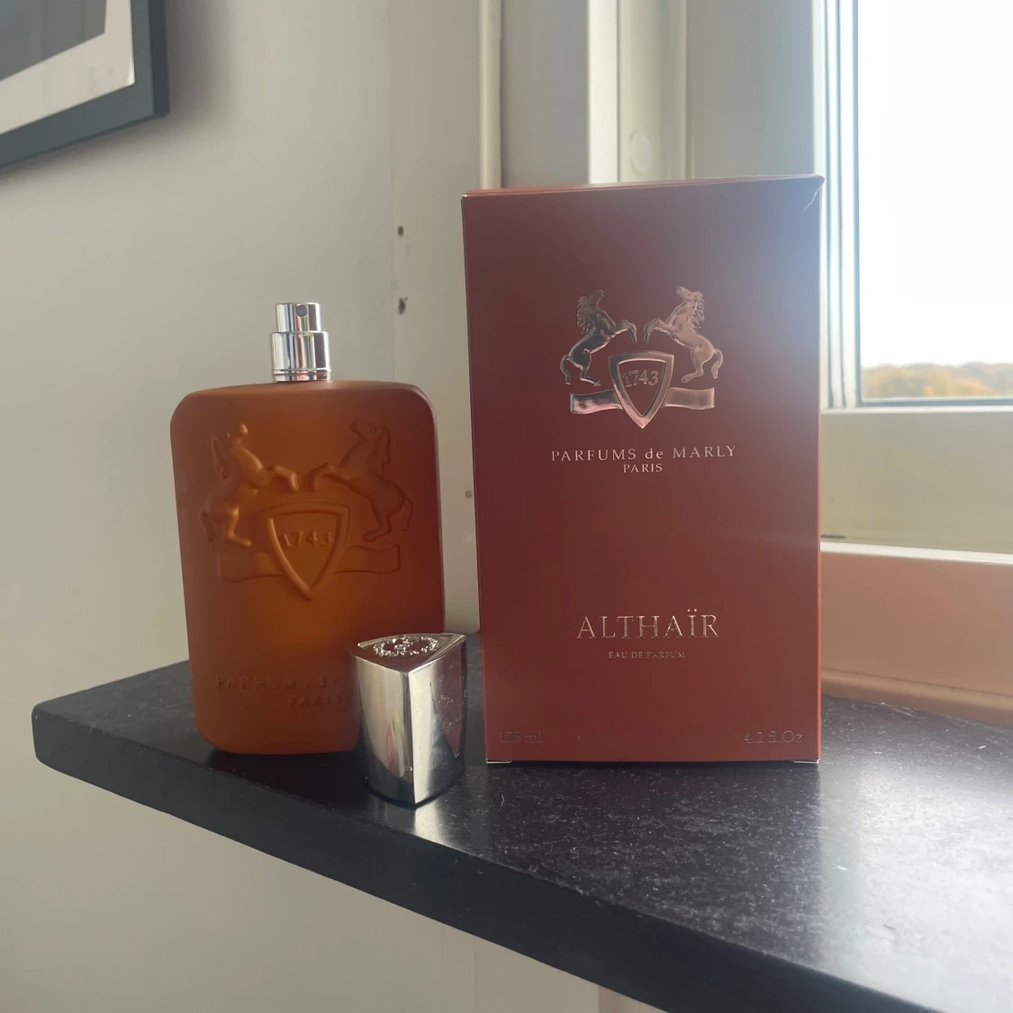 Althaïr från Parfums de Marly, 125 ml, tillverkad i Frankrike. Innehåller noter av kanel, kardemumma, apelsinblomma, bergamott, bourbonvanilj, elemi, pralin, mysk, ambroxan och guaiacträ. En modern och lyxig doft för dig som vill sticka ut. Helt ny inprincip använt endast ca 5 spray köpt i Paris Pris kan diskuteras