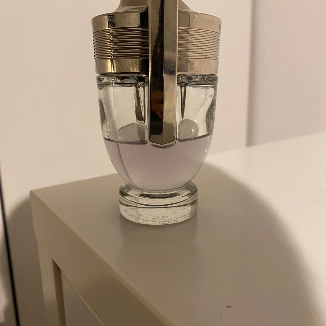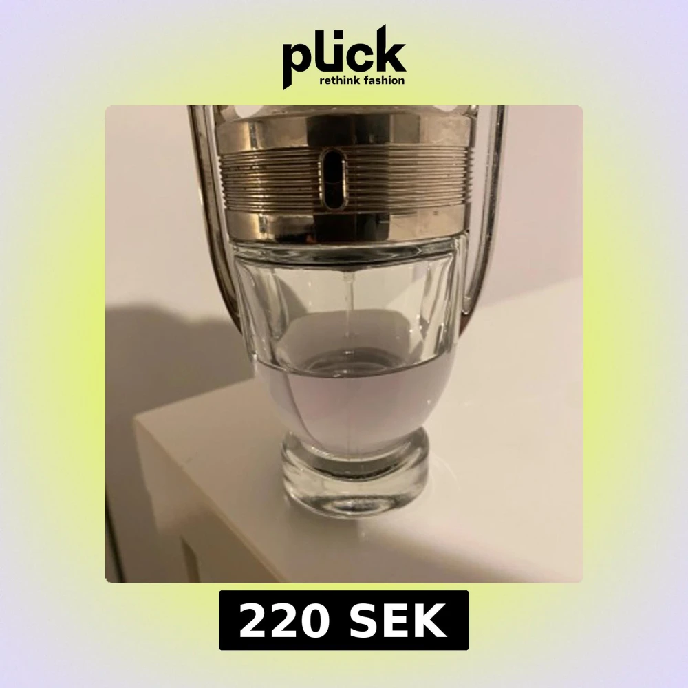 Säljer en Paco Rabanne Invictus parfym i den ikoniska troféformade flaskan. Flaskan är i glas med silverfärgade detaljer och innehåller en ljuslila vätska. Perfekt för dig som gillar fräscha och sportiga dofter. Flaskan är 50 ml men du ser på bilden hur mycket de är kvar.