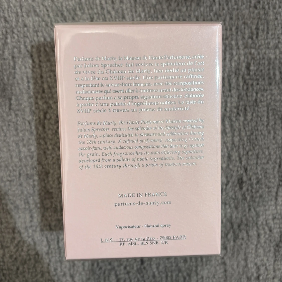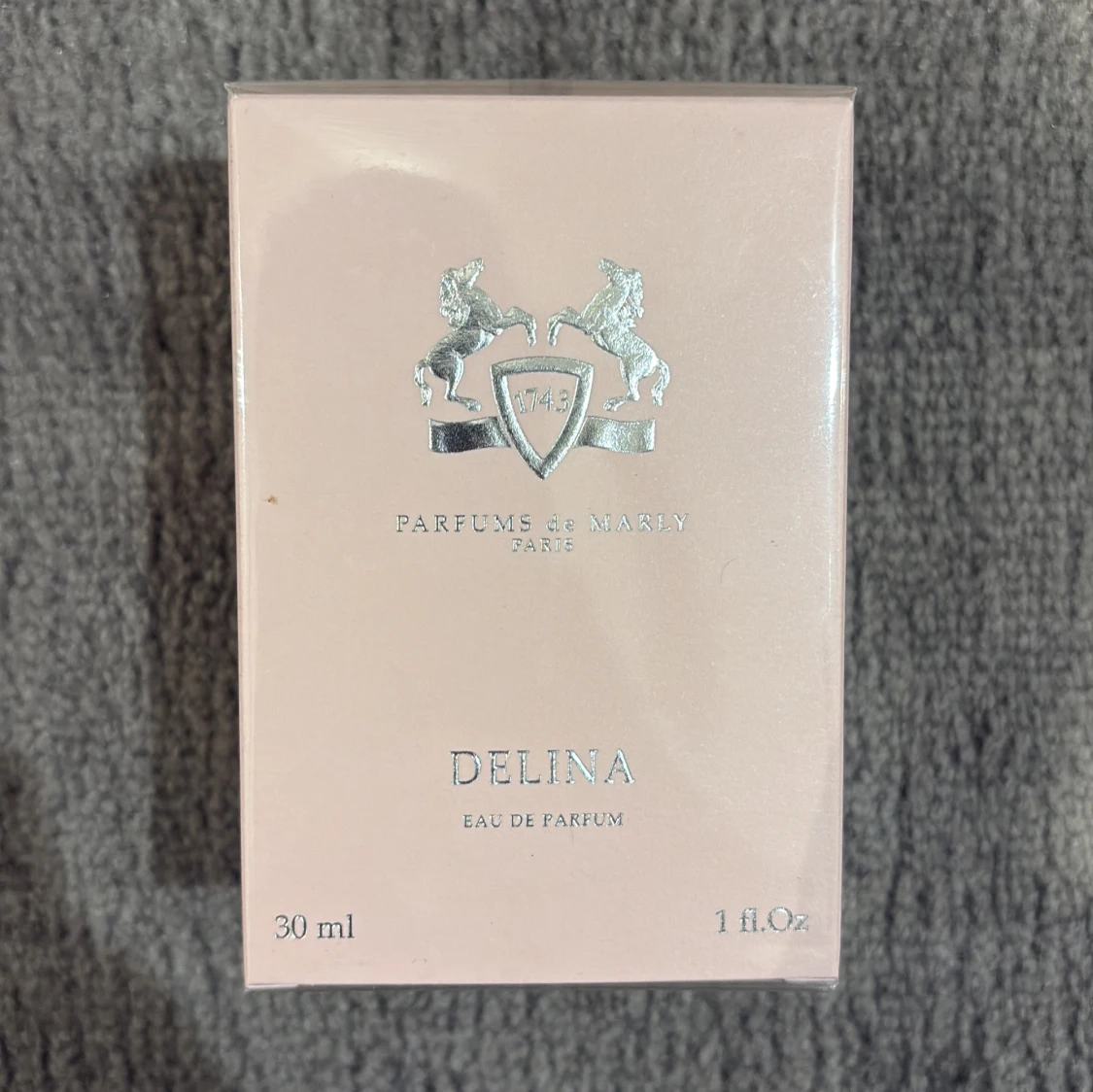 Delina Eau de Parfum från Parfums de Marly i en lyxig ljusrosa kartong med silverdetaljer. Flaskan rymmer 30 ml och är tillverkad i Frankrike. En exklusiv doft med elegant design och klassisk känsla, perfekt för dig som gillar sofistikerade parfymer.