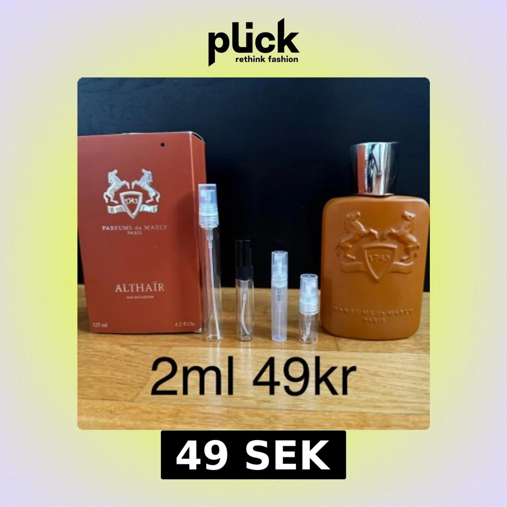 Parfums de Marly Althaïr är en lyxig herrparfym med en söt och vaniljdoft. Doften har varma kryddiga toner av kanel och musky. FINNS ÄVEN I 2,3,5,10ML KOLLA PROFILEN FÖR ANDRA STORLEKAR ! 2ml 39kr | 3ml 49kr | 5ml 89kr | 10ml 159kr | Nypris ca 2500-3000kr