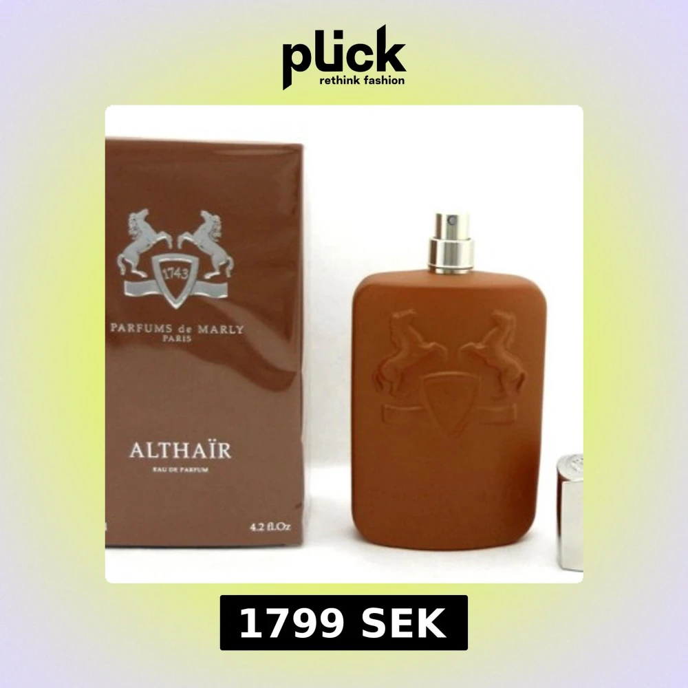 Althaïr Eau de Parfum från Parfums de Marly i en snygg brun, matt flaska med silverdetaljer och reliefmönster av två hästar. Flaskan har en modern, fyrkantig form och känns lyxig och stilren. Perfekt för dig som gillar exklusiva dofter.