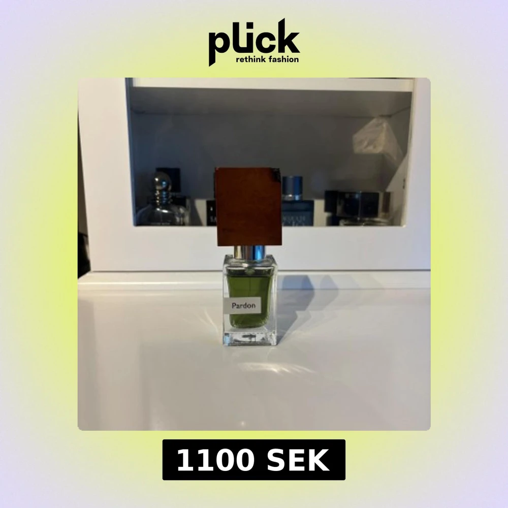 Unik parfym med grön vätska i en fyrkantig glasflaska och ett distinkt brunt trälock. Märkt med 'Pardon' på framsidan. Flaskan har en exklusiv och modern design som sticker ut i parfymhyllan.
