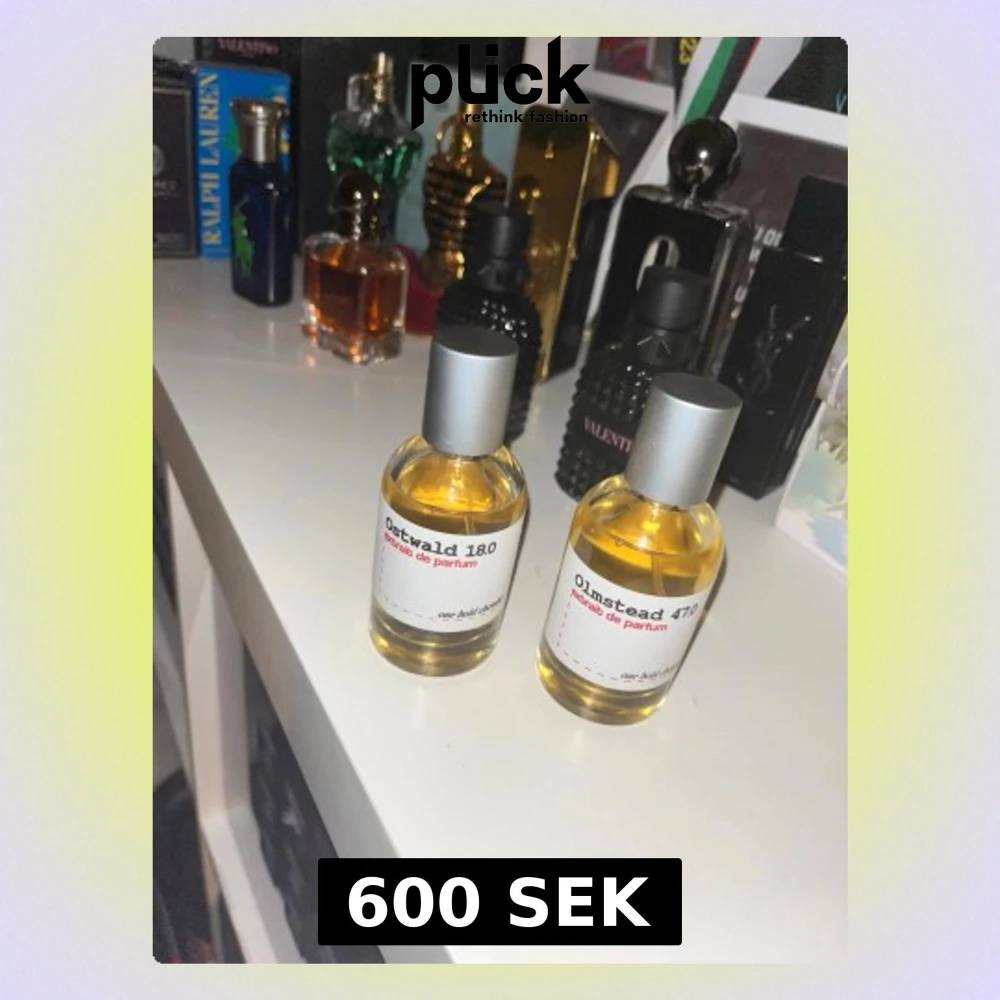 Två flaskor Eau de Parfum från Ostwald, modellerna 180 och Olmstead 47.0. Flaskorna är runda med transparent glas och silverfärgade lock. Parfymen har en gyllene nyans och modern, minimalistisk etikett. Perfekt för dig som gillar unika dofter. Ostvald 18.0 är inspirerad av ombre Normade från Louis vuitton och Olmstead 47.0 är inspirerad av Oud satin Mood från Maison Francis Kurkdjian