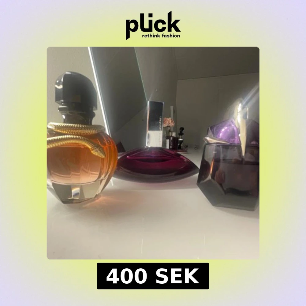 Alien mugler 30ml ungefär 7ml använd 400kr Pure XS paco rabanne 50ml ungefär 5ml använd 400kr Euphoria Calvin klein 100ml ungefär 5ml använd 400kr
