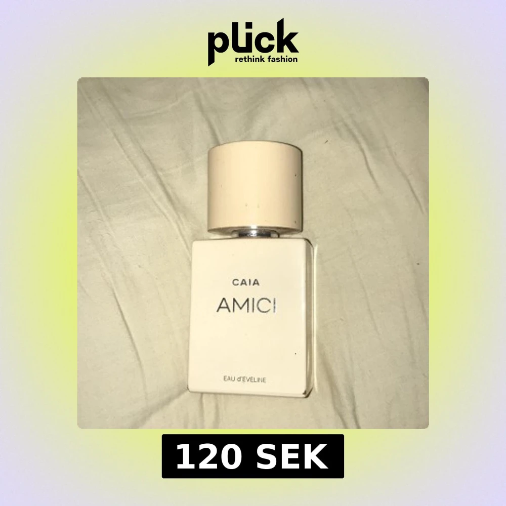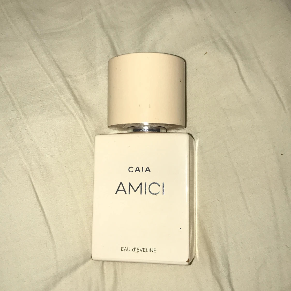 Säljer en elegant parfymflaska från CAIA med namnet AMICI. Flaskan är stilrent designad i en ljus beige färg med en matchande kork. Perfekt för den som söker en sofistikerad doft.❤️flaskan är precis nästan full bara använt nån enstaka sprut.