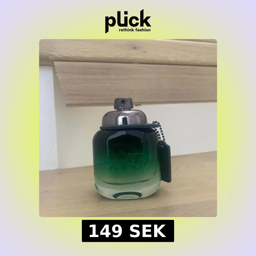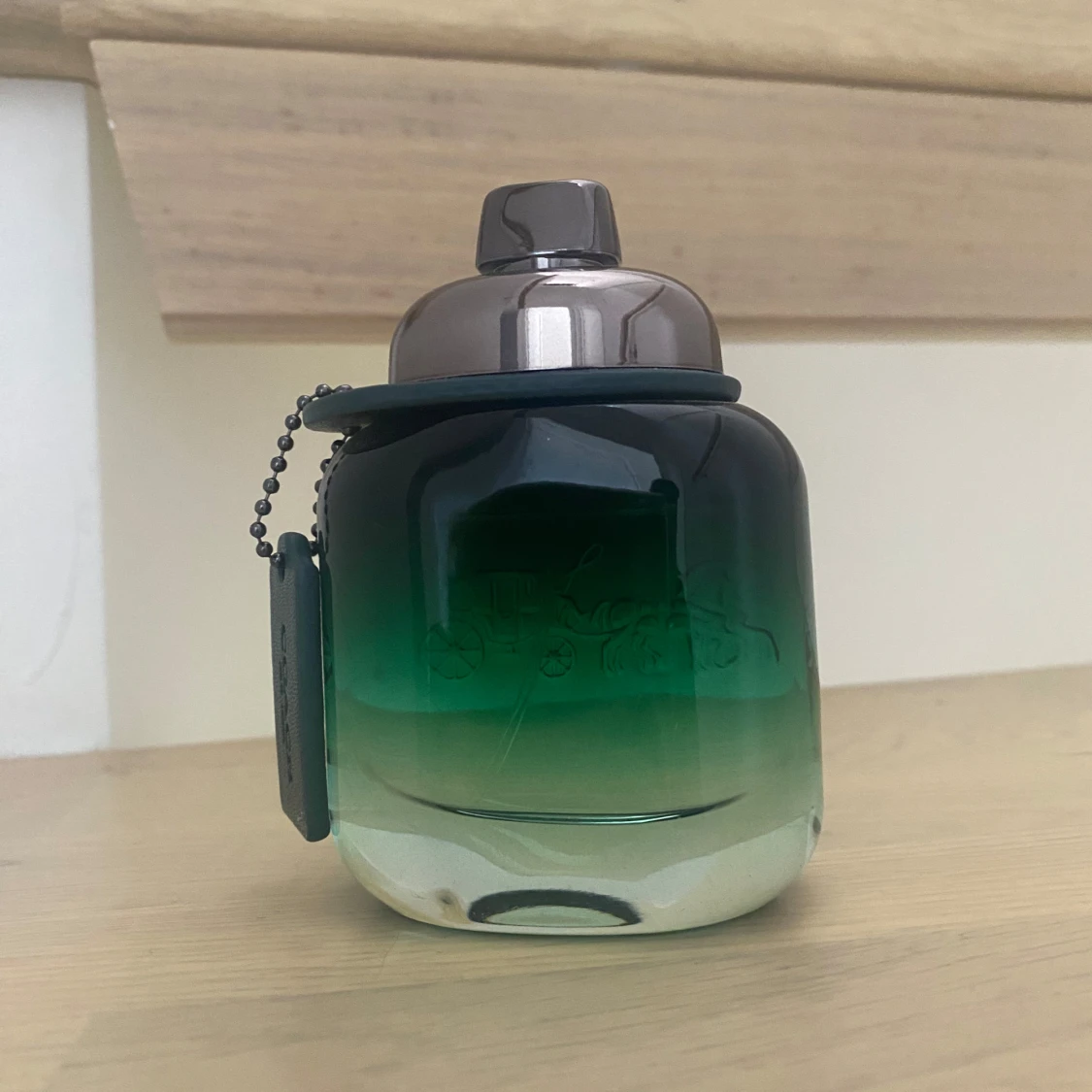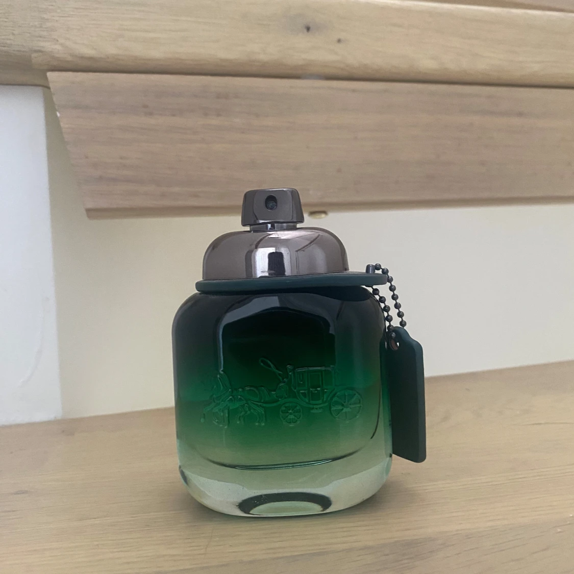 Coach herrparfym i en snygg grön glasflaska med metallfärgat spraylock och Coach-logga ingraverad på framsidan. Flaskan har en cool gradient från mörkgrönt till klart glas och en svart tag i kedja hänger på sidan. Perfekt för dig som gillar stilrena och moderna dofter.
