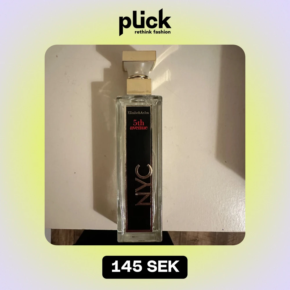 Säljer en elegant parfym från Elizabeth Arden, 5th Avenue NYC. Flaskan är rektangulär och genomskinlig med en stilren design. Den har en guldig kork och svart etikett med röd text. Perfekt för den som älskar en klassisk och sofistikerad doft.