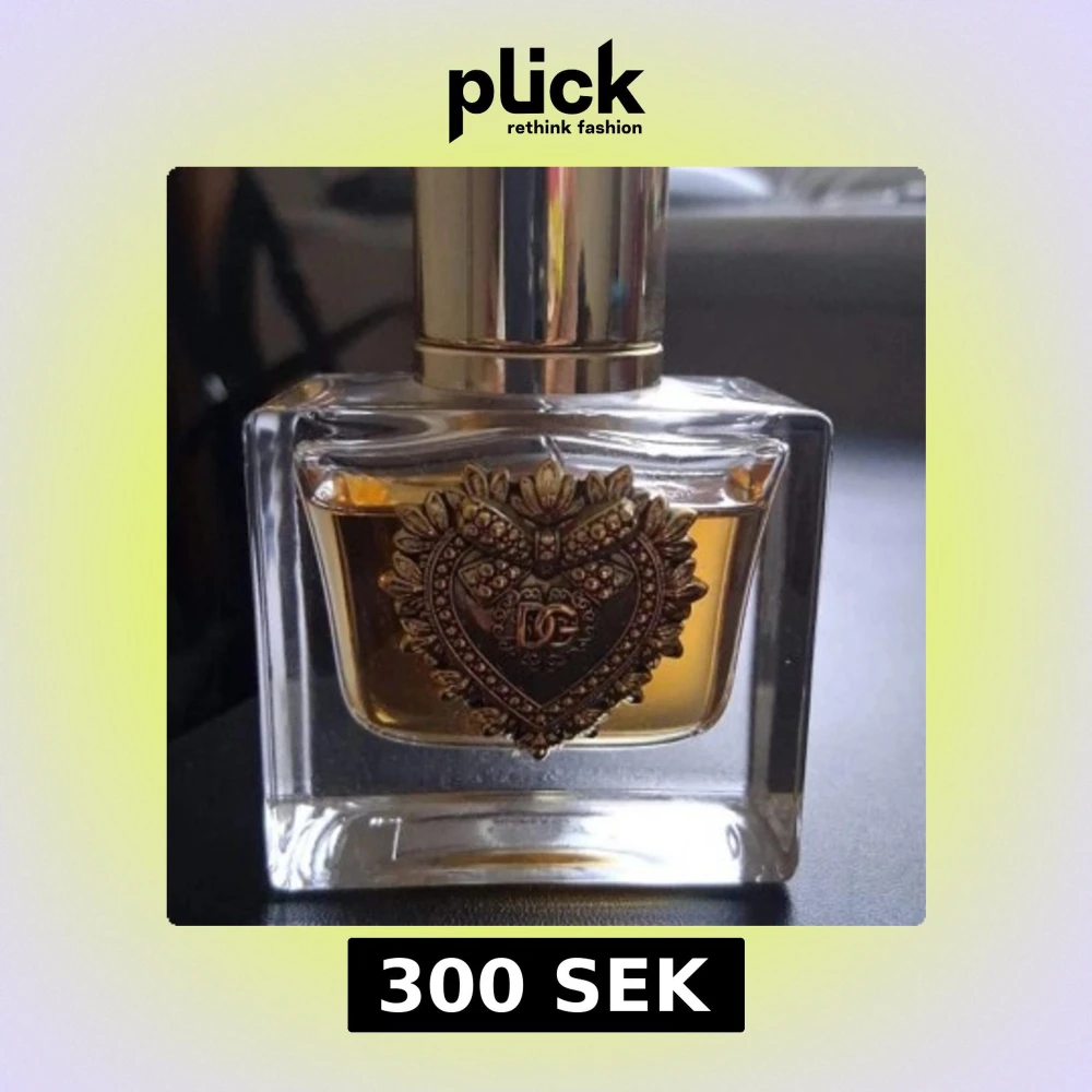Elegant parfymflaska från Dolce & Gabbana med en gyllene dekorativ detalj i form av ett hjärta på framsidan. Flaskan är rektangulär och genomskinlig med en gyllene kork. Perfekt för den som älskar lyxiga och stilrena dofter. 30ml, har andvänts få gånger, kommer utan förpackning