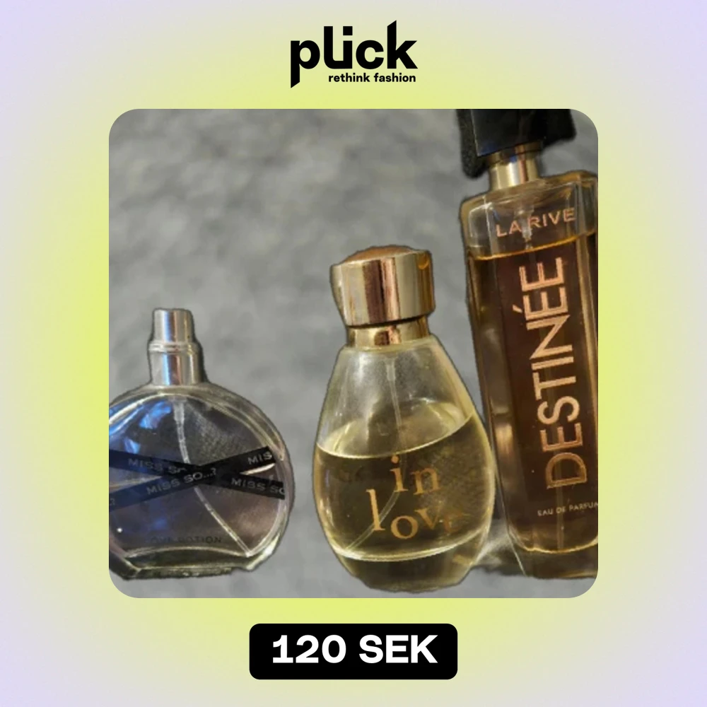 Säljer ett set med tre parfymer från La Rive: Destinée, In Love, Love Potion. Miss so - Love potion, nypris 109:-/50ML. Cirka 1/2 kvar In love, nypris 205:-/90ML. Cirka 2/3 kvar. Destinee, nypris 89.90:-/90ML Minst 9/10 kvar 120 :- för allihopa