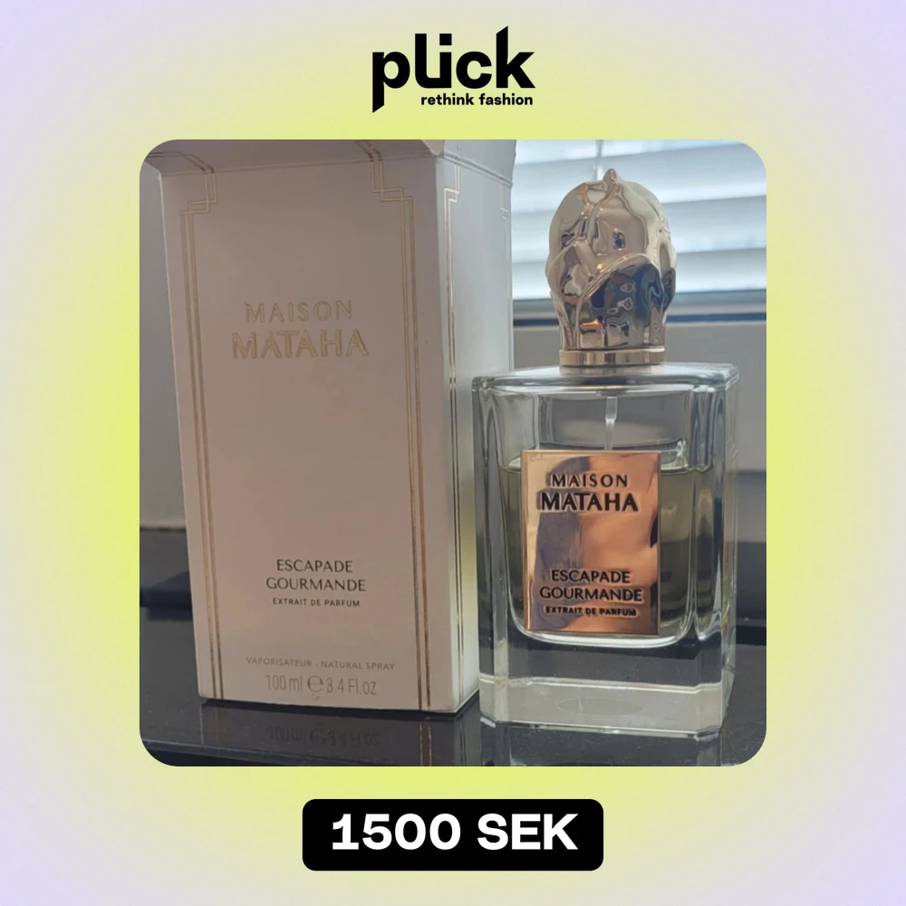 Säljer en lyxig parfym från Maison Mataha, Escapade Gourmande. Flaskan är elegant med en fyrkantig form och en unik guldfärgad kork som ser ut som en skulptur. Parfymen är 100 ml och kommer i en stilren vit förpackning. Perfekt för den som älskar exklusiva dofter!