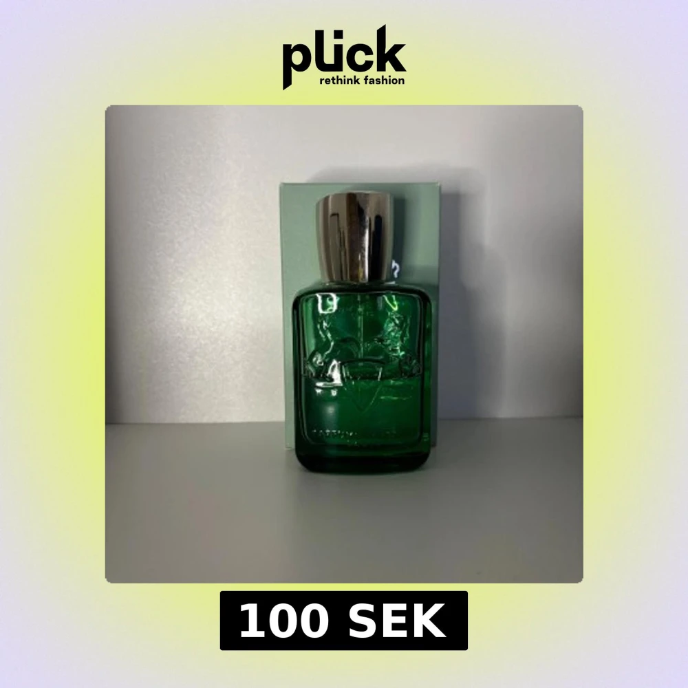 Lyxig parfymflaska från Parfums de Marly i smaragdgrönt glas med silverfärgat lock. Flaskan har en elegant, rektangulär form och är dekorerad med reliefmönster av två hästar och en sköld på framsidan. Perfekt för dig som gillar exklusiva dofter.