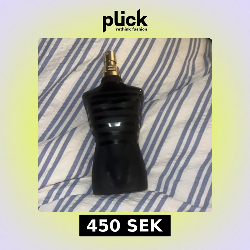 Säljer en ikonisk parfymflaska från Jean Paul Gaultier, Le Male Le Parfum. Flaskan är formad som en manlig torso i mattsvart glas med blanka svarta ränder och har en guldfärgad spraykork. Volymen är 125 ml. Där mitt pekfinger är där är parfymen nästan som ny