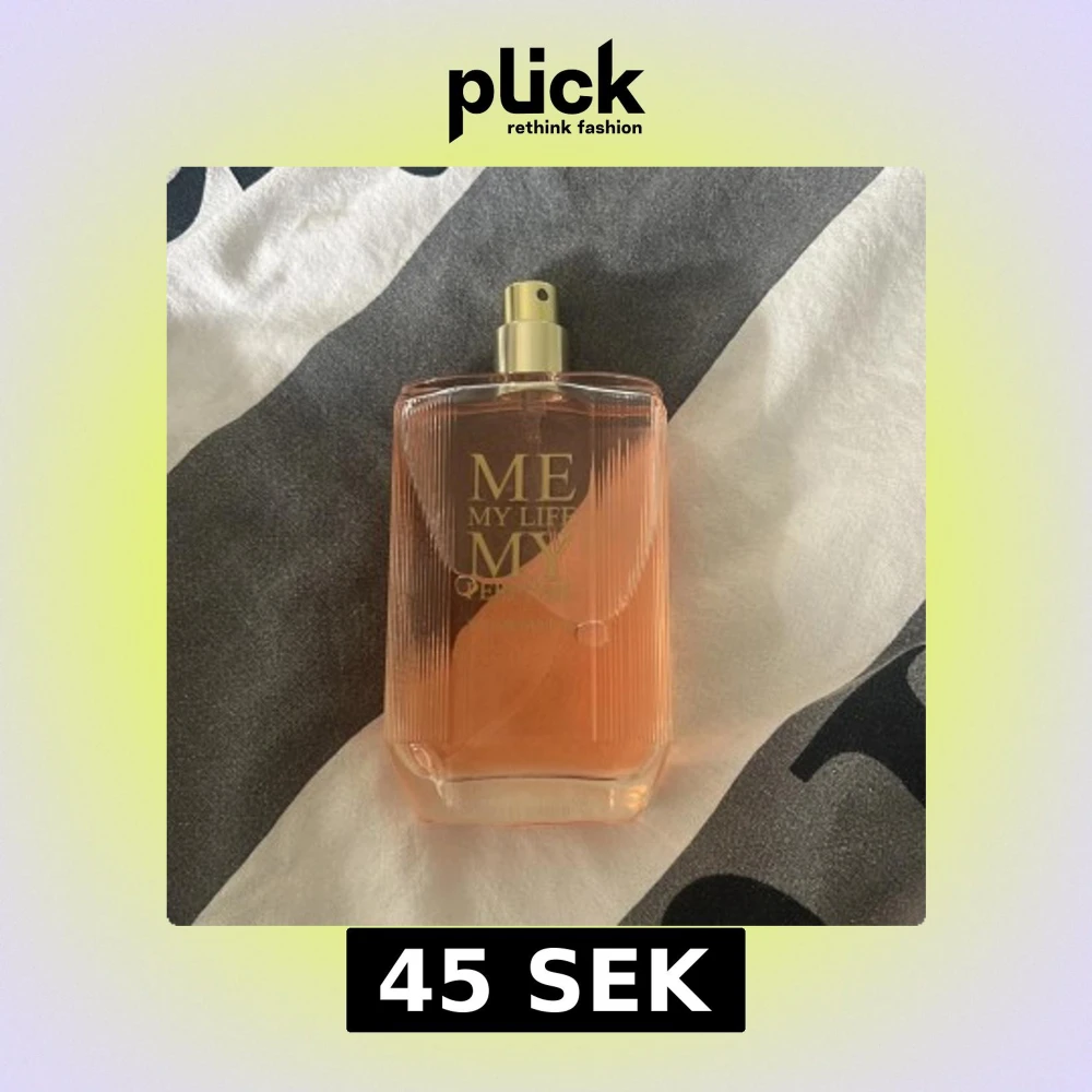En stilren parfym i en rektangulär glasflaska med räfflade kanter och guldig spraykork. Flaskan har en ljusrosa ton och texten 'ME MY LIFE MY PERFUME' i guld på framsidan. Perfekt för dig som gillar snygg design och fräscha dofter. Kostade runt 100kr helt ny pris går att diskutera!