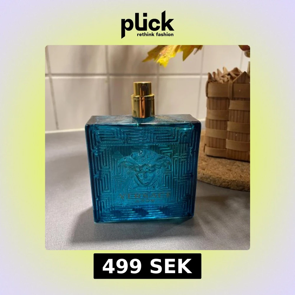 Säljer en elegant blå parfymflaska från Versace med ett intrikat mönster och en gyllene spraykork. Flaskan har en fyrkantig form och pryds av det ikoniska Medusa-huvudet. Perfekt för den stilmedvetna.