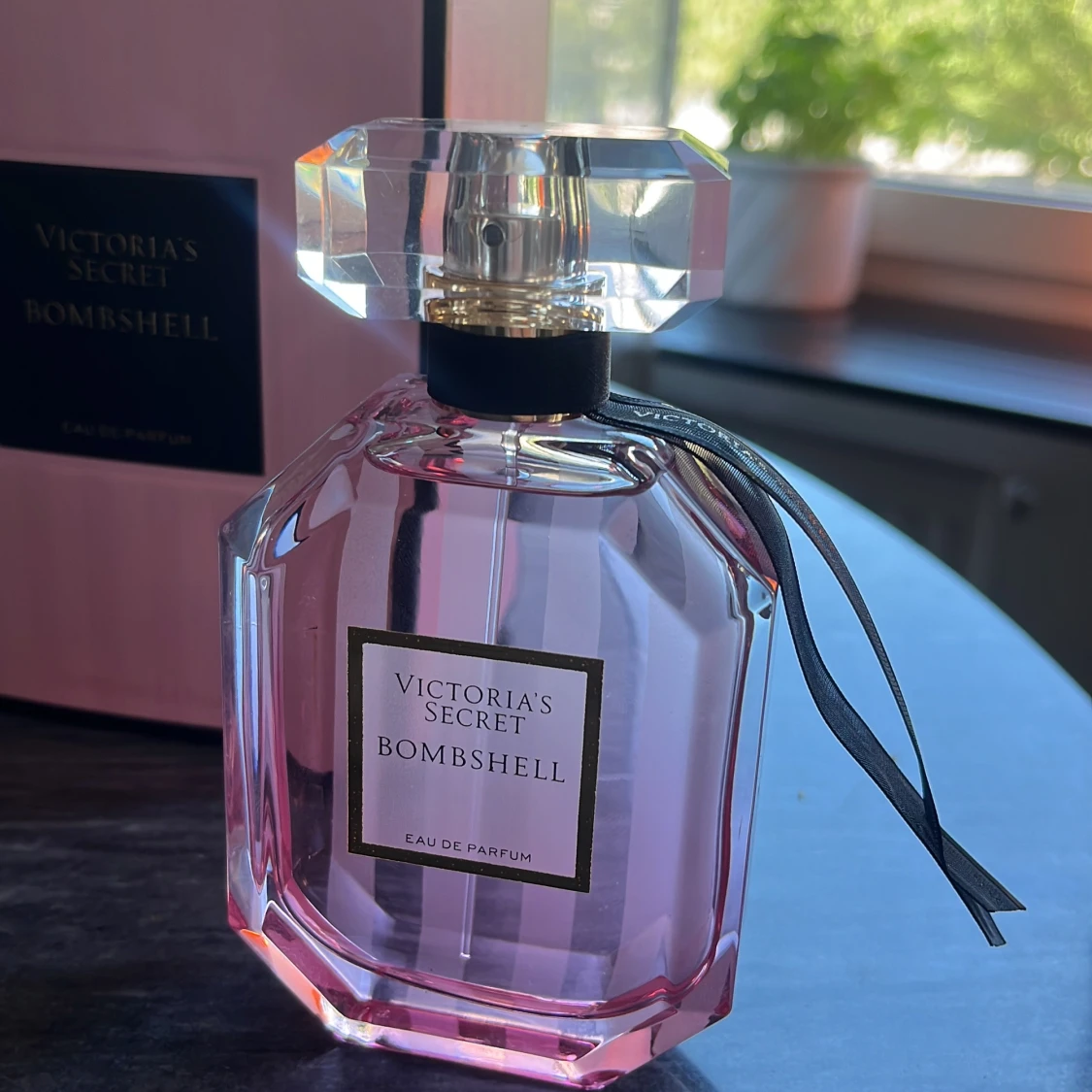 Helt ny oanvänd! Bombshell Eau de Parfum från Victoria's Secret i en lyxig, multifasetterad glasflaska med rosa ton och elegant svart band runt halsen. Kommer i en snygg rosa kartong med svart detalj. Flaskan rymmer 100 ml och har en kristalliknande kork. Kvitto finns.