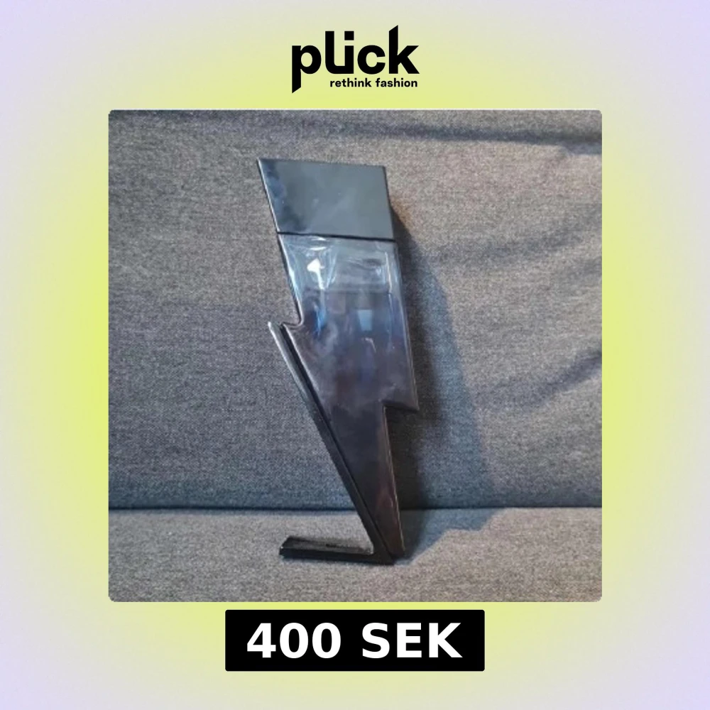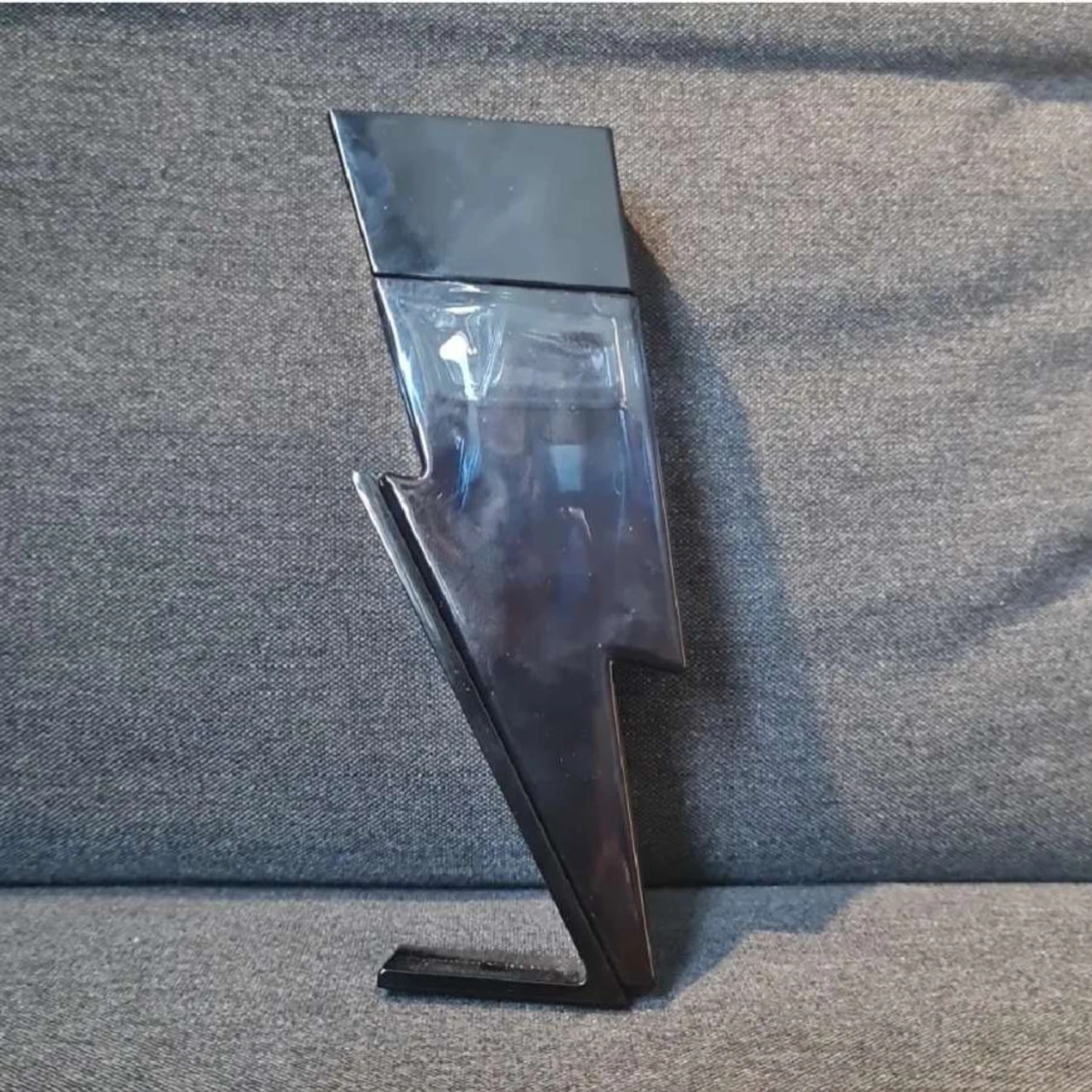 Unik parfymflaska formad som en blixt, med en modern och stilren design. Flaskan är svart och transparent, vilket ger en cool och edgy look. Perfekt för den som vill ha något annorlunda på parfymhyllan.