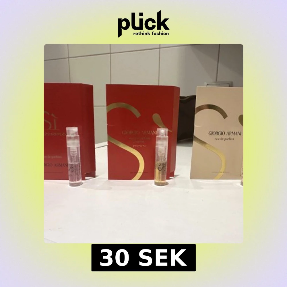 Tre parfymprover från Giorgio Armani. Säljs för 30 kr styck. Fraktpris 22kr. 1: Si Passione Eau de Parfum, 1.2 ml. 2: Si Passione Eau de Parfum Intense, 1.2 ml. 3: Si Eau de Parfum, 1.2 ml.