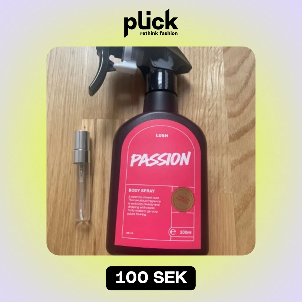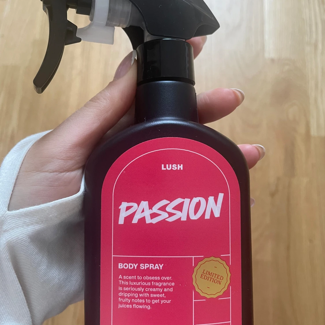 Säljer 5 ml av en Limited Edition Passion Body Spray från Lush. Den kommer i en cool, mörkbrun sprayflaska med en stor etikett i rött och vitt. Doften är lyxig och fruktig, perfekt för att få igång dina sinnen. Flaskan rymmer 200 ml och är lätt att a