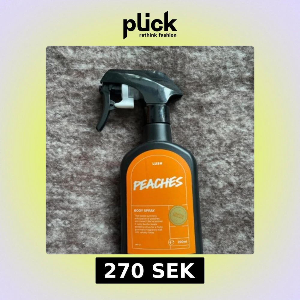 Fräsch och fruktig body spray från Lush med doft av persika. Kommer i en svart sprayflaska med orange etikett. Perfekt för att ge en somrig och söt doft. Väldigt mycket kvar och en väldigt fräsch doft , säljs för 180 kr, finns mer än hälften kvar,
