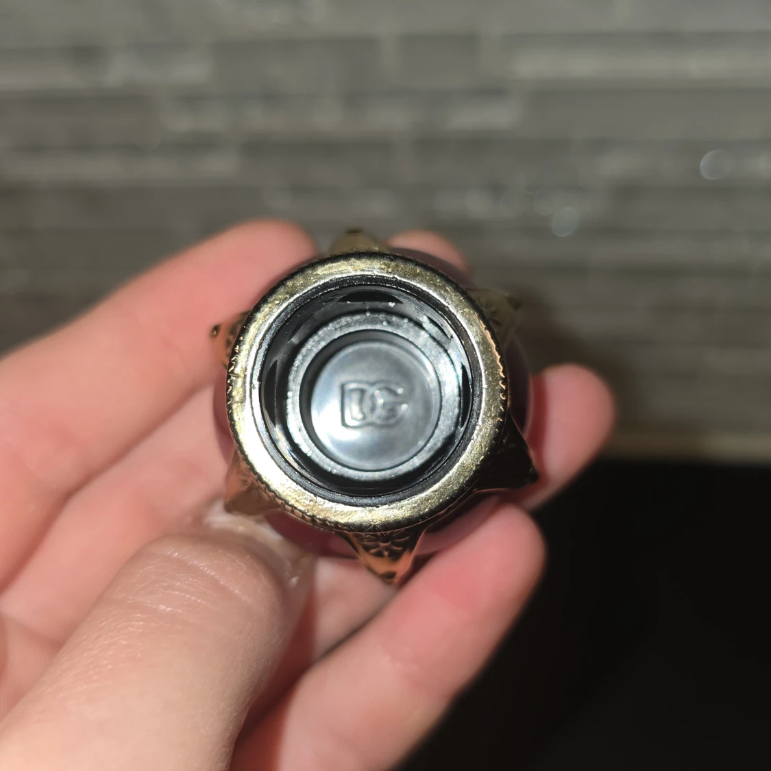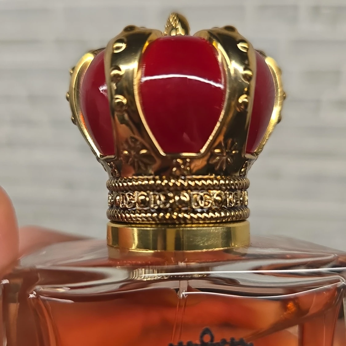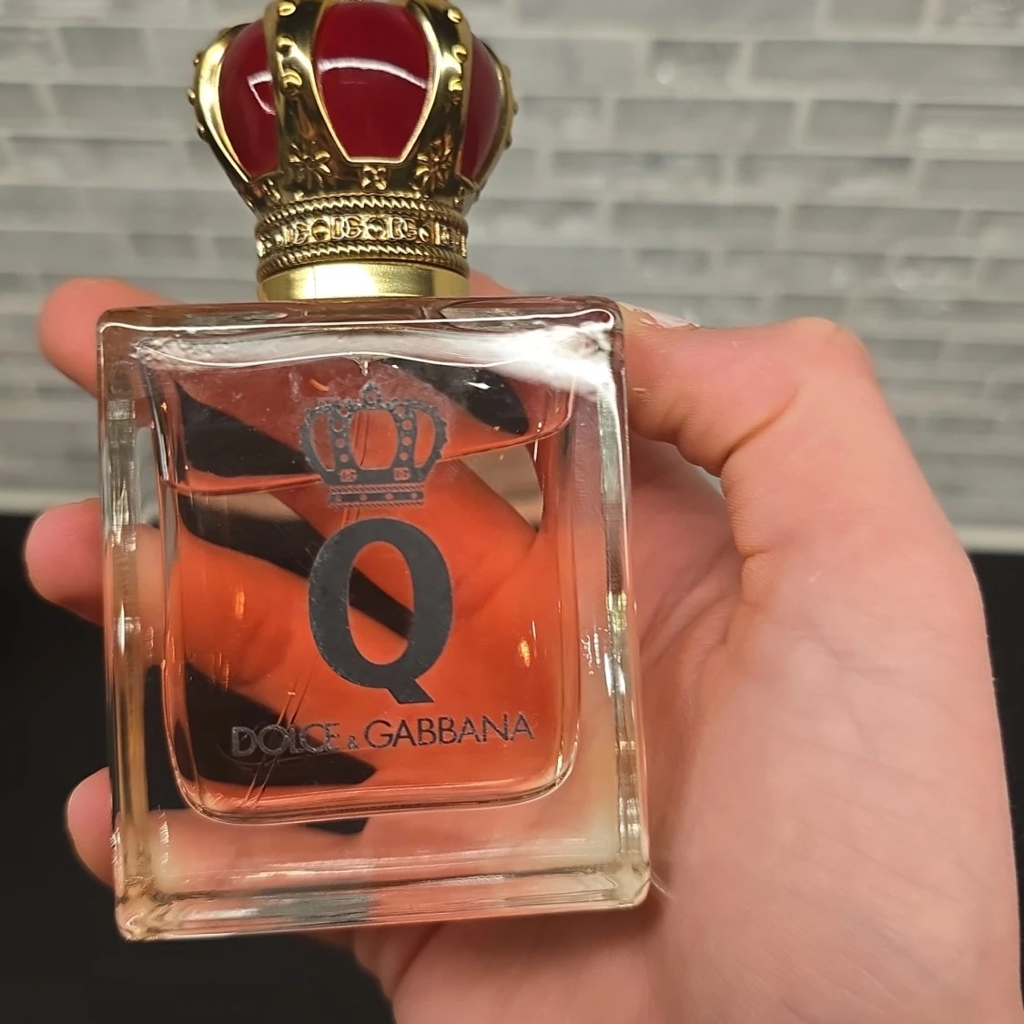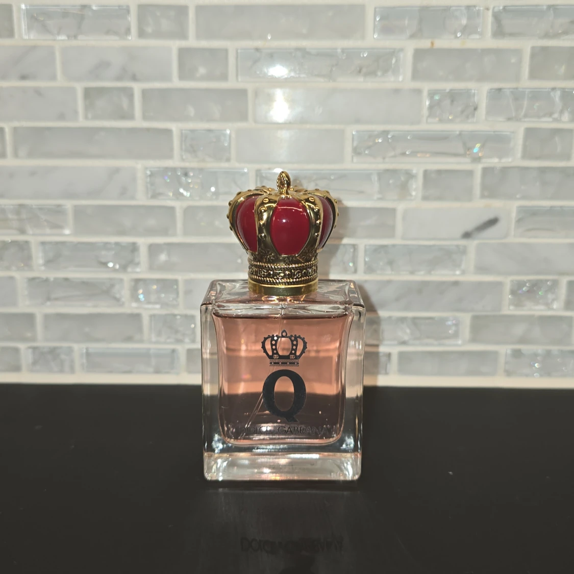 Säljer en lyxig parfym från Dolce & Gabbana med en elegant flaska. Flaskan är fyrkantig med en kunglig krona som lock i rött och guld. Parfymen har en sofistikerad doft och kommer i en 50 ml flaska.