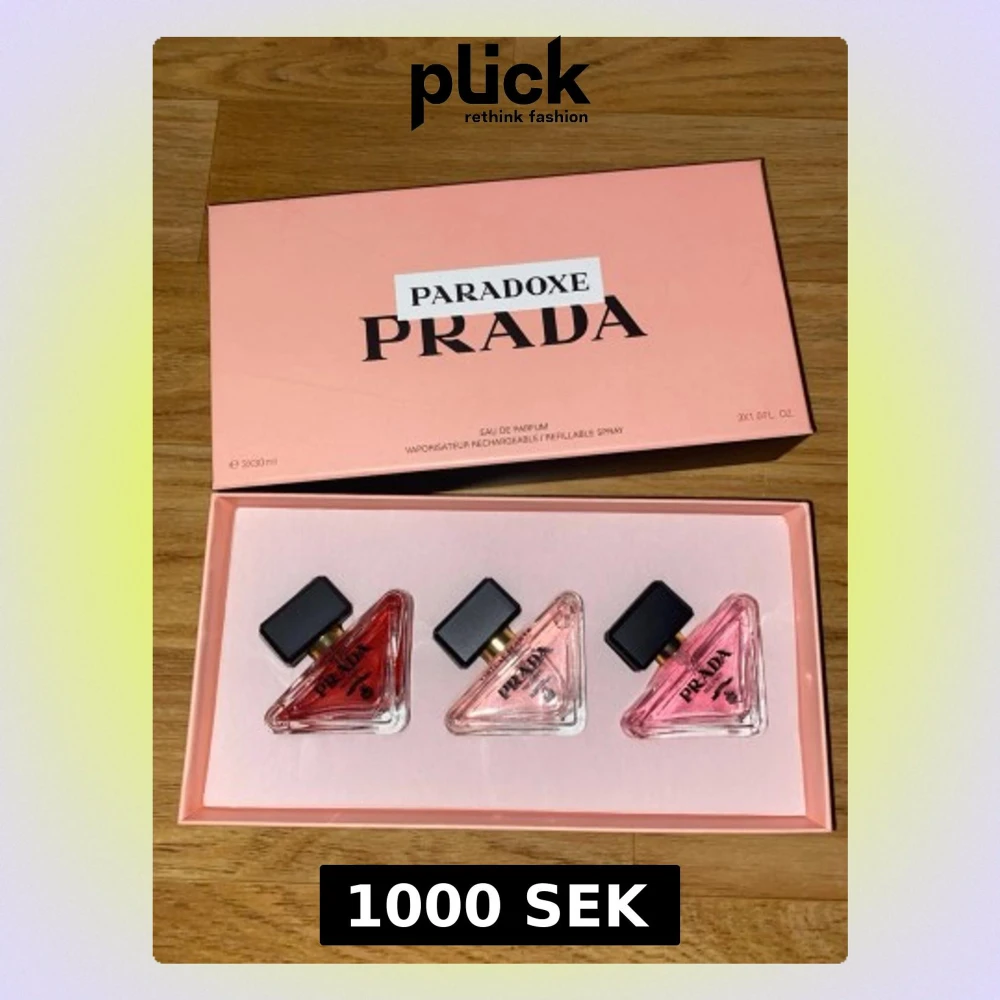 Exklusivt parfymset från Prada med tre olika dofter ur Paradoxe-serien. Flaskorna är trekantiga i glas med svarta lock och rosa, ljusrosa och orange toner. Lyxig förpackning i rosa med svart text. Varje flaska innehåller 30 ml Eau de Parfum och är påfyllningsbar.