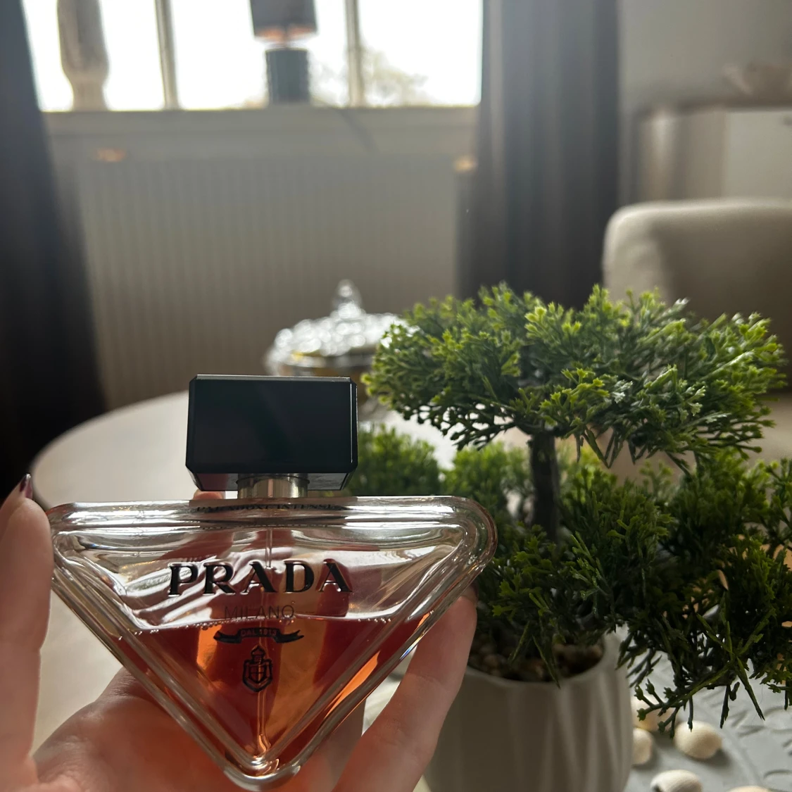 Snygg och modern Eau de Parfum från Prada Beauty. Perfekt för dig som vill sticka ut med en ikonisk flaska och exklusiv känsla. Flaskan har en unik design som drar blickarna till sig. 90ml, skulle säga att det är 50 ml kvar åtminstone.