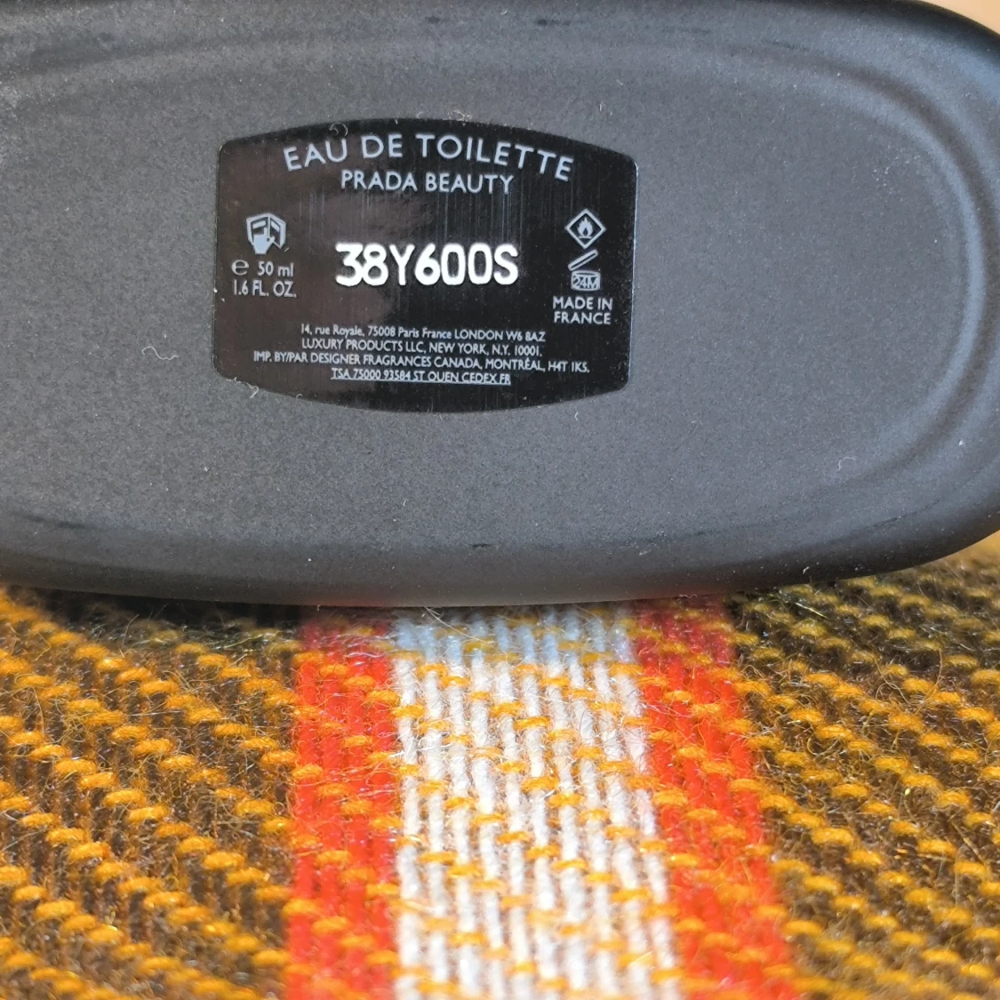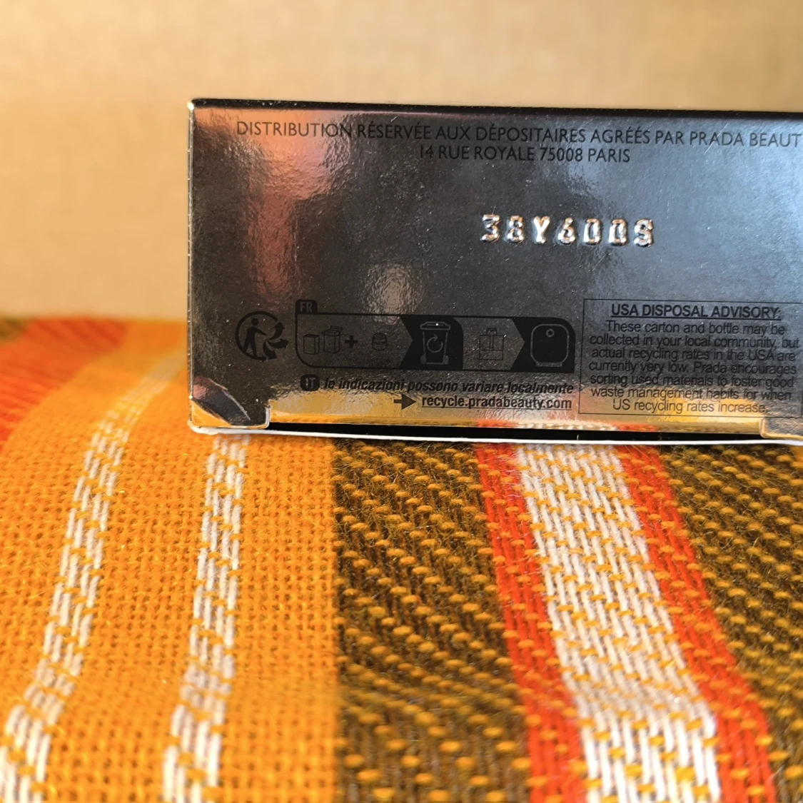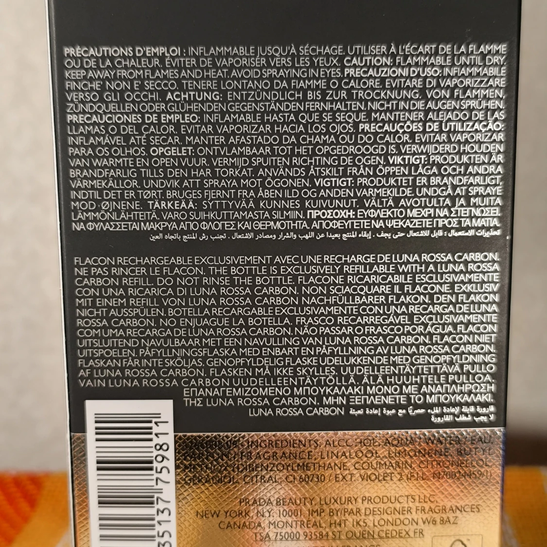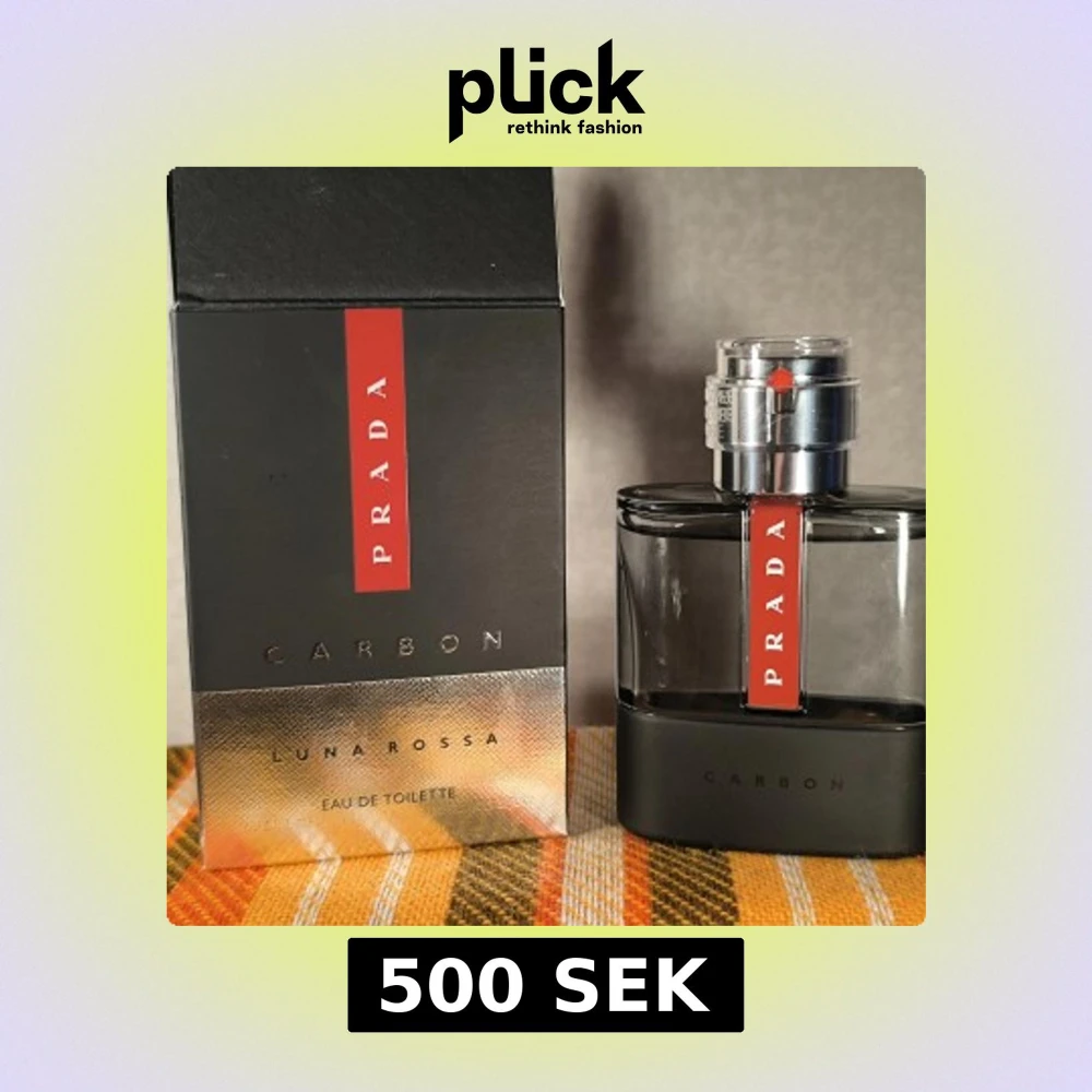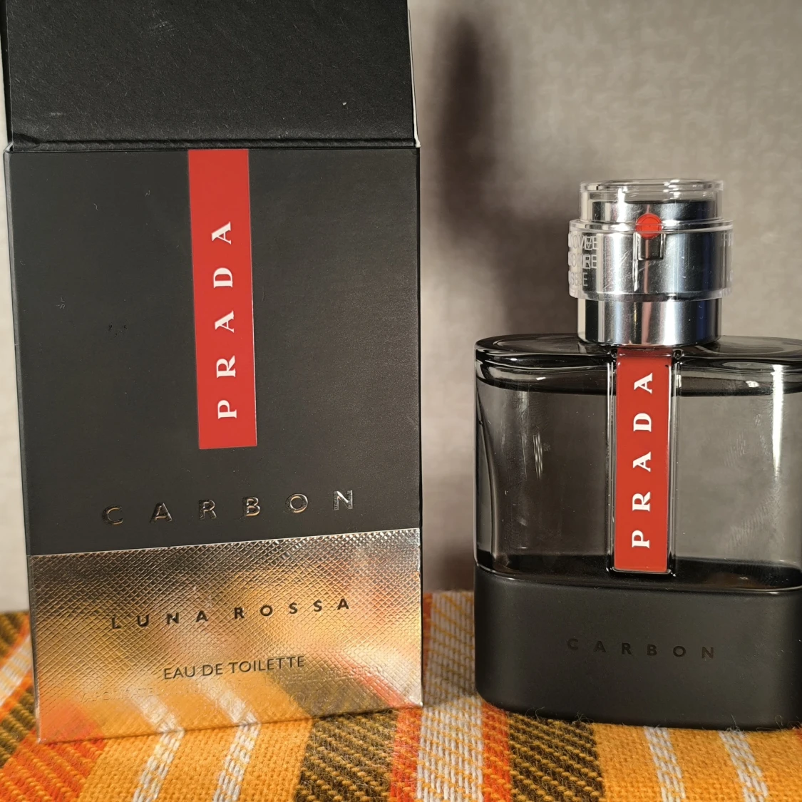 Prada Luna Rossa Carbon Eau de Toilette 50ml med elegant svart och silverfärgad glasflaska. Flaskan har en röd vertikal detalj med Prada-loggan och en robust metallkork. Doften är modern och maskulin, perfekt för dig som gillar exklusiva parfymer. Knappt använd.