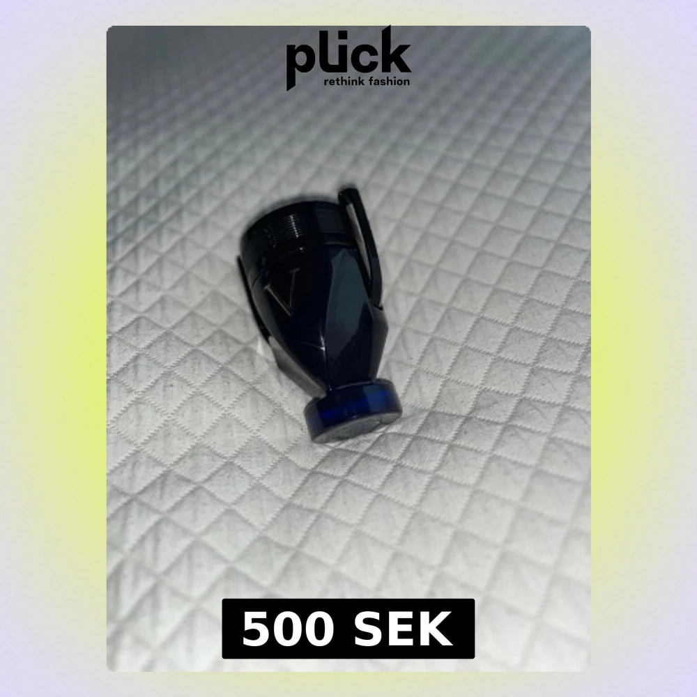 Säljer en Paco Rabanne Invictus Victory parfym i en cool mörkblå troféformad flaska med svarta detaljer och ett stort V i guld på framsidan. Flaskan är tillverkad i glas och plast och har en modern, sportig design.