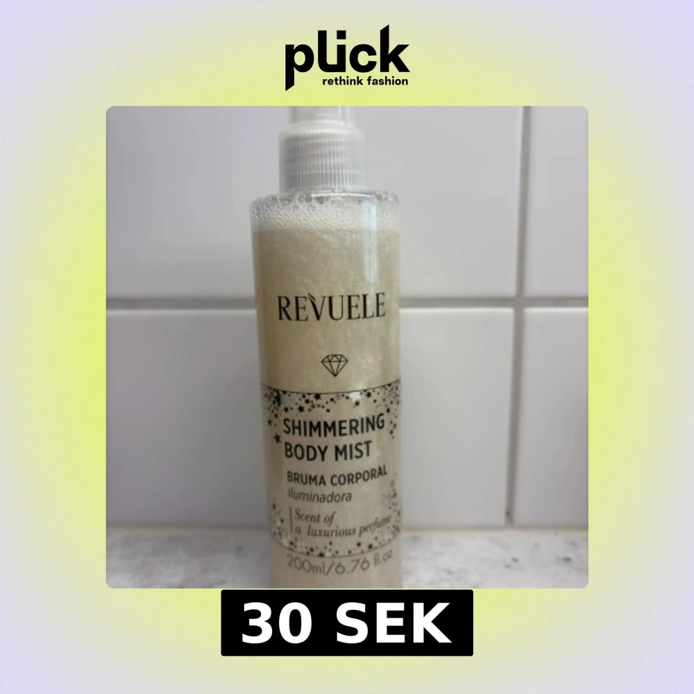 Revuele Shimmering Body Mist med silvrig skimmer och lyxig doft. Sprayen kommer i en genomskinlig plastflaska med pump och innehåller 200 ml. Berikad med gurk- och kokosnötsextrakt för återfuktning och en glittrande finish på huden.