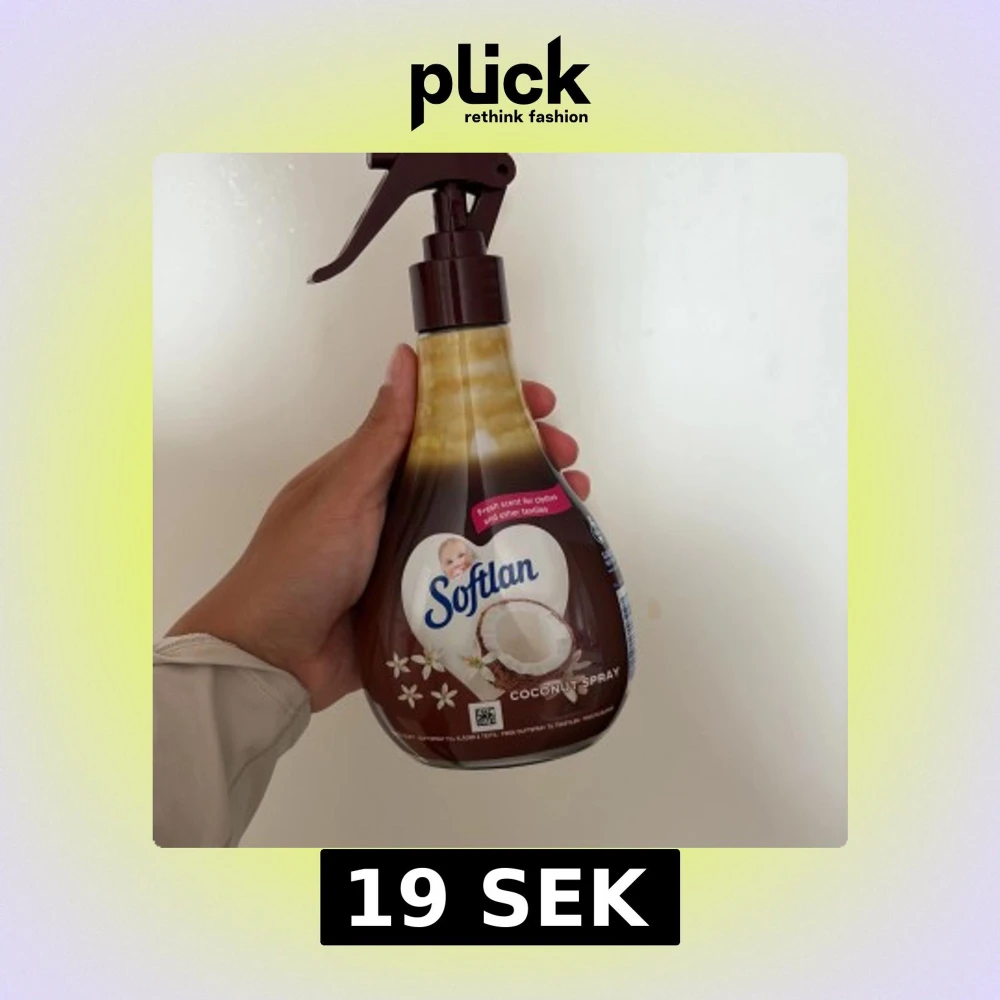Bilderna visar en flaska Softlan Coconut Spray, ett textilspray med kokosdoft för kläder och textilier.Den återstående mängden är från den hula delen o neråt.