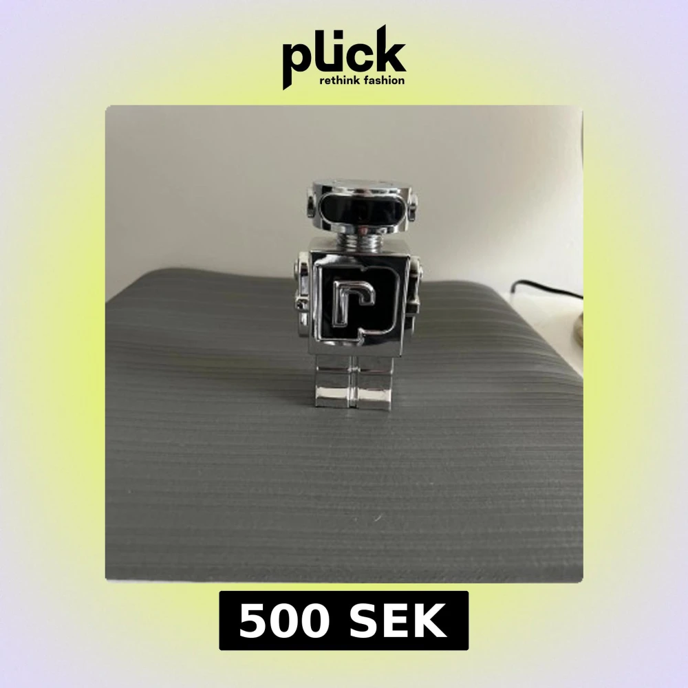 Snygg och futuristisk parfymflaska i form av en robot. Flaskan är i glänsande silver med en stor bokstav 'P' på framsidan. Perfekt för den som gillar unika och moderna designinslag i sin parfymkollektion. Det är mer än halva flaskan kvar