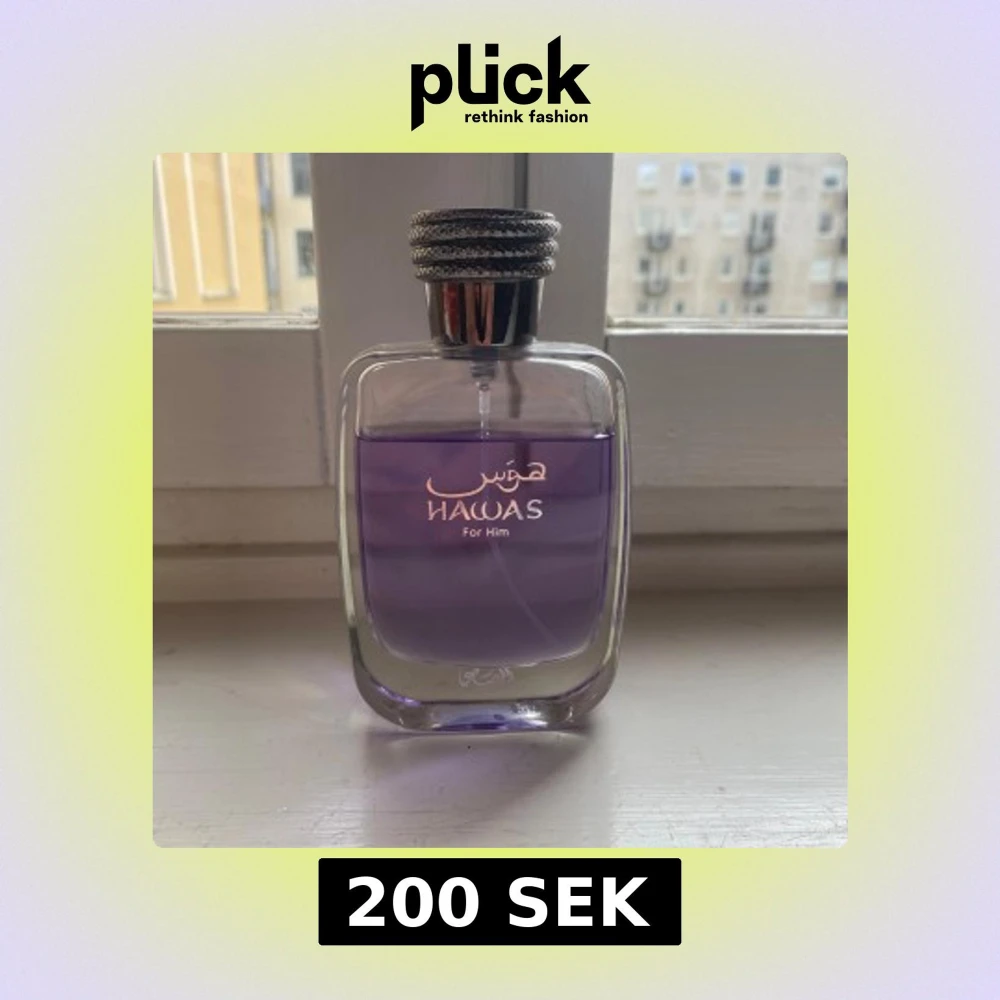En stilren parfymflaska med lila vätska och silverfärgad kork. Flaskan har raka linjer och tydlig etikett med texten 'Hawaf For Him' på framsidan. Perfekt för dig som gillar eleganta och moderna dofter.