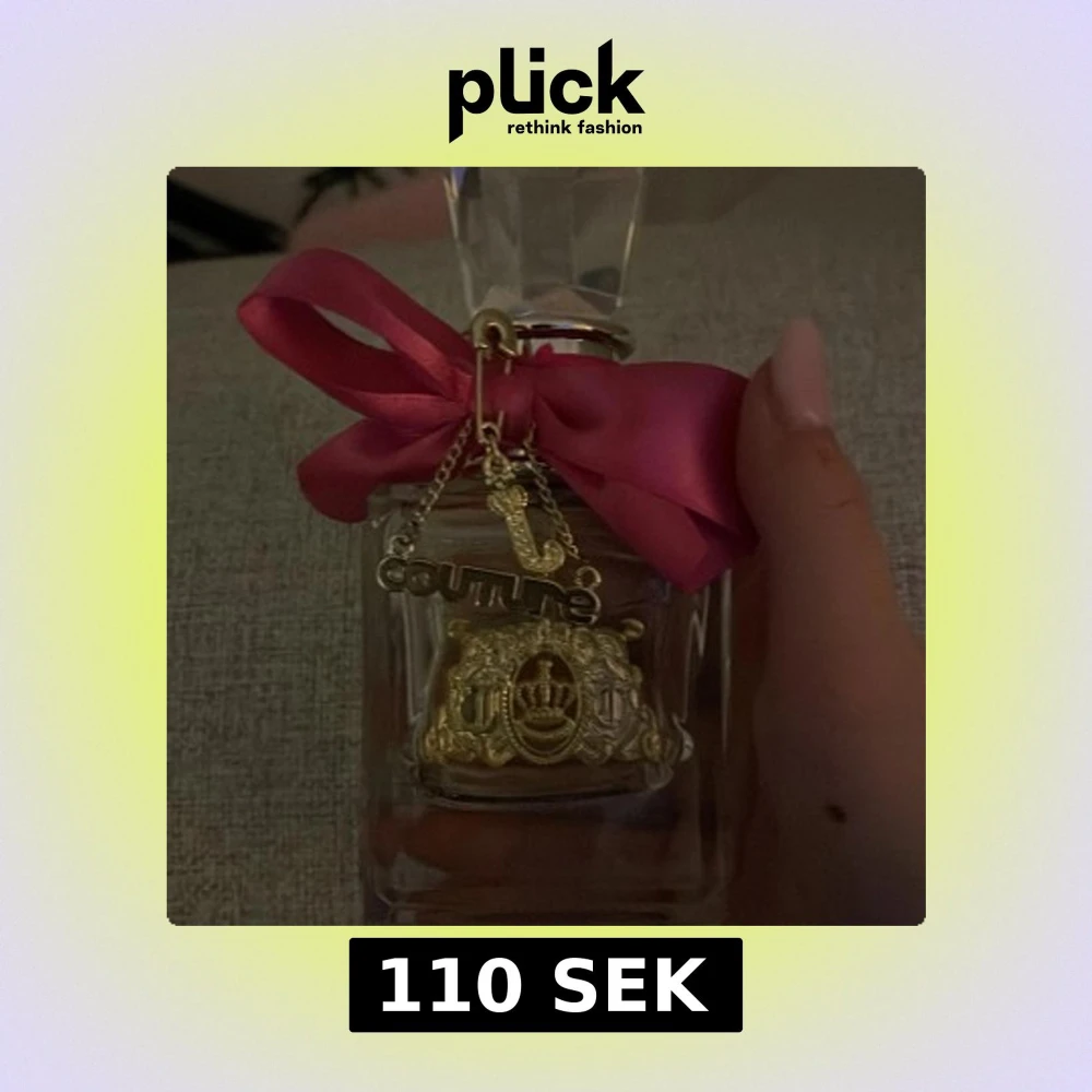 Elegant parfymflaska med en stor rosa rosett och guldfärgad dekor. Flaskan har en fyrkantig form och ett kristalliknande lock. Perfekt för den som älskar lyxiga detaljer och en feminin touch.men har inte så mycket kvar