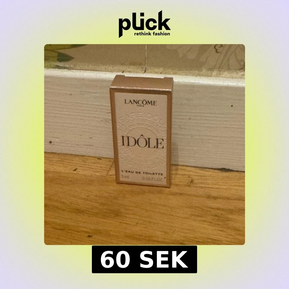 Säljer en miniflaska av Lancôme Idôle Eau de Toilette, 5 ml. Parfymen kommer i en elegant, rektangulär ask i ljusrosa och guldiga toner. Perfekt att ha med i väskan för en fräsch doftboost när som helst. Har 4 stycken 60kr/st