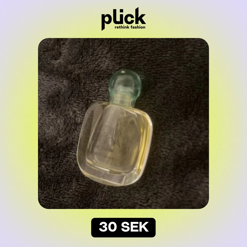Säljer en elegant parfymflaska med en unik form och en grön kork. Flaskan är genomskinlig och innehåller en ljusgul doft. Perfekt för att ge en touch av lyx till din samling eller som en fin present.