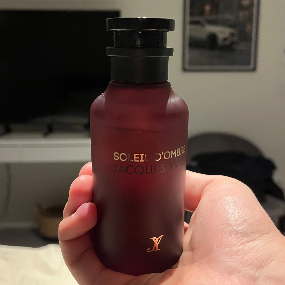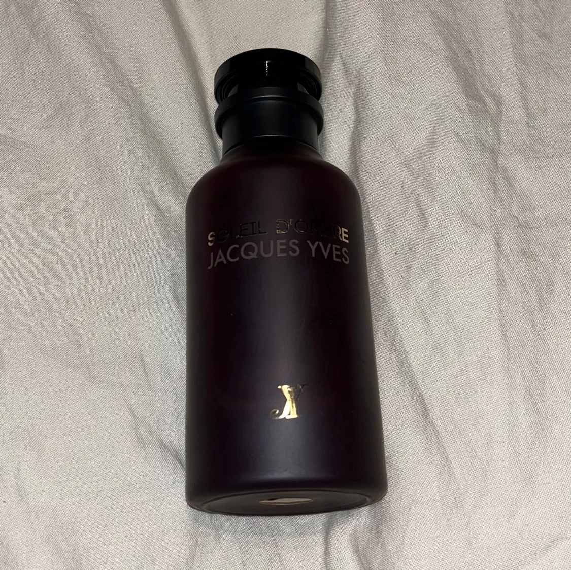 En lyxig parfymflaska i matt mörklila glas med guldfärgade detaljer och svart lock. Flaskan har en elegant och stilren design med texten 'Soleil d'Ombre' och 'Jacques Yves' i guld. Perfekt för dig som gillar exklusiva dofter och snygg inredning på hyllan.