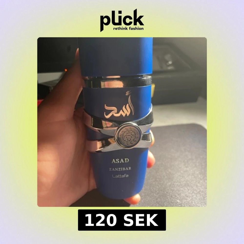 Snygg parfymflaska från Lattafa, Asad Zanzibar. Den luktar oerhört gott och ger en ”varm sommardag på en tropisk strand” vibe. Märkets logga syns både på toppen och botten. Eau de Parfum, 100 ml. Knappast använd, ett riktigt fynd 🤩