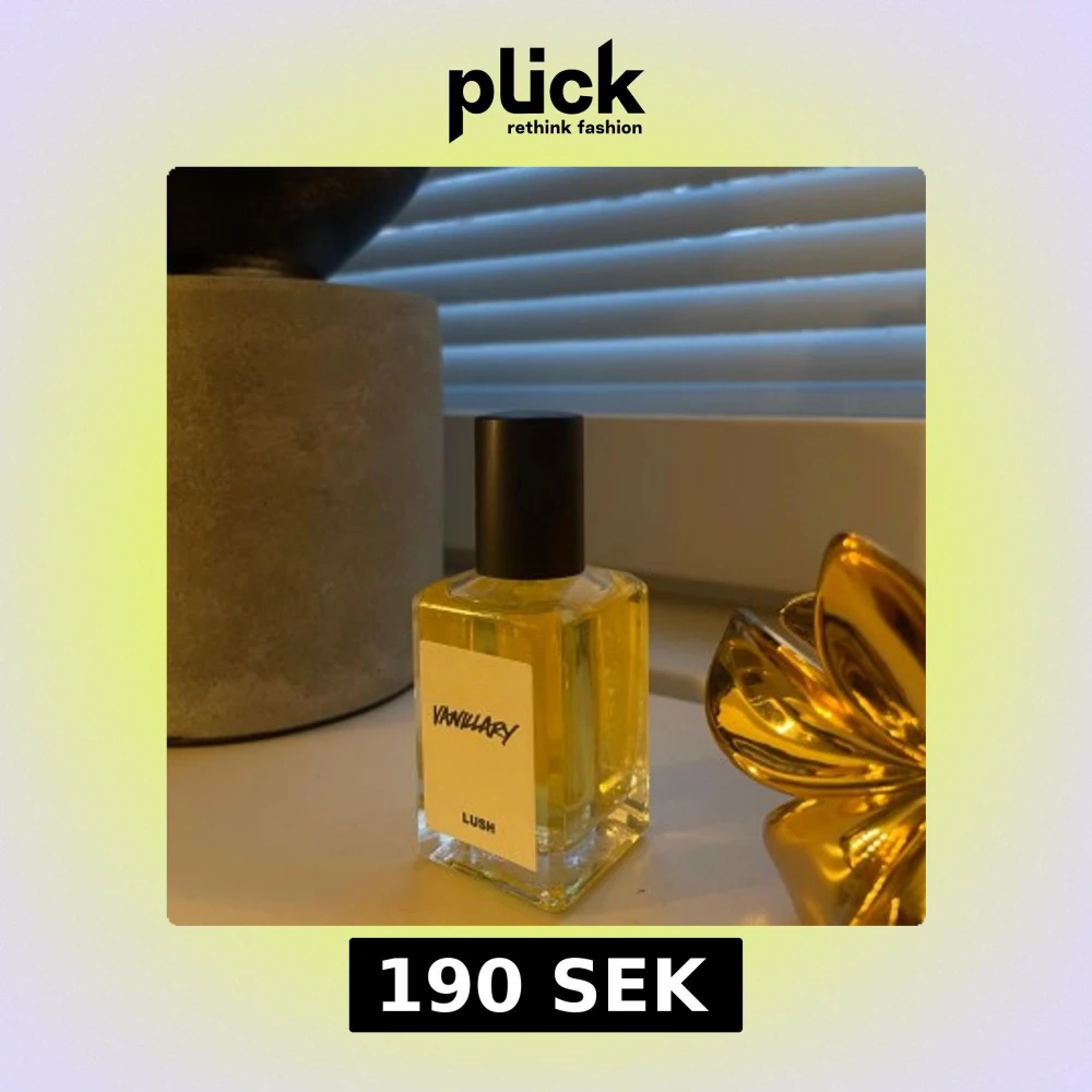 En elegant flaska med Vanillary parfym från Lush. Parfymen har en varm och söt doft med inslag av vanilj. Flaskan är rektangulär med en svart kork och en enkel etikett.