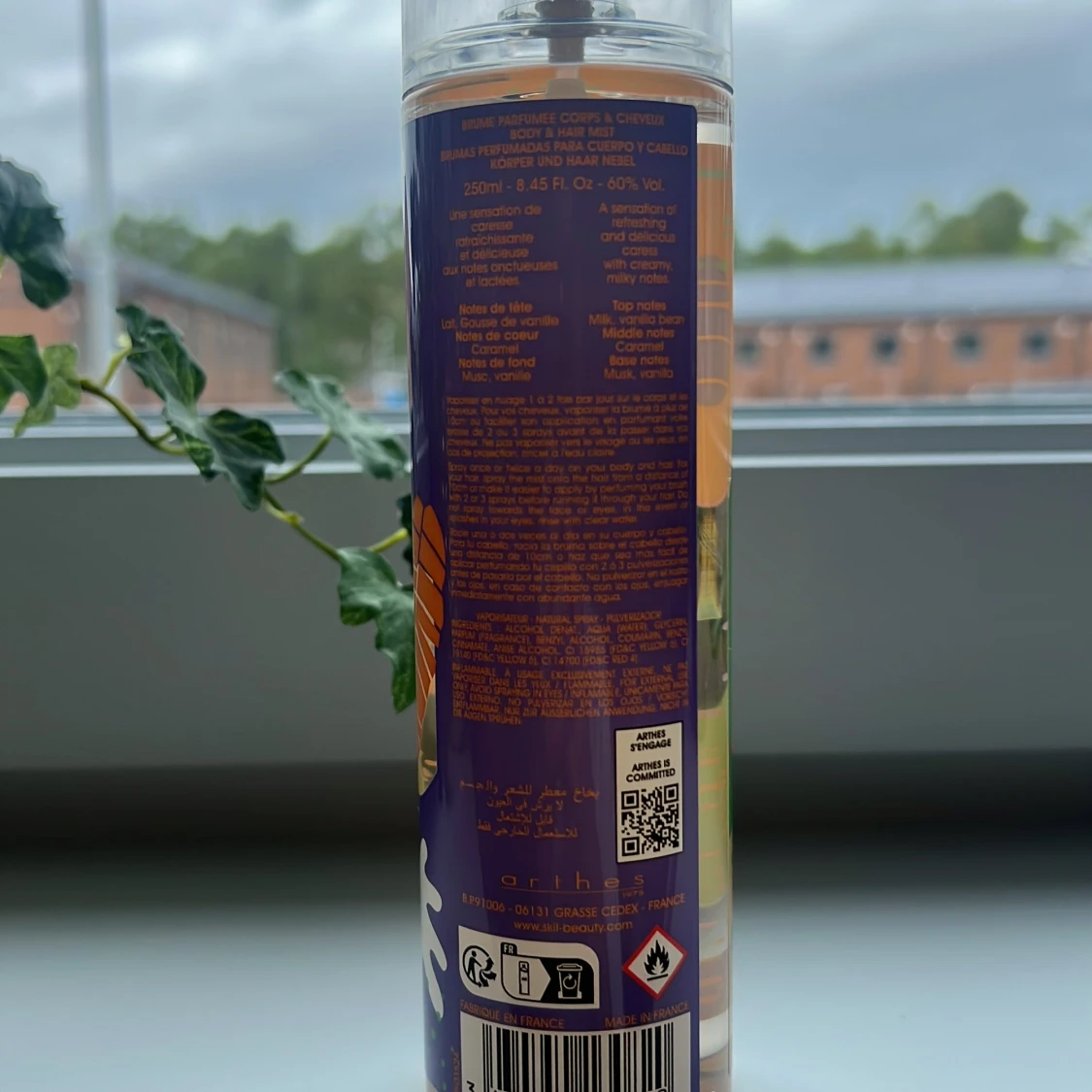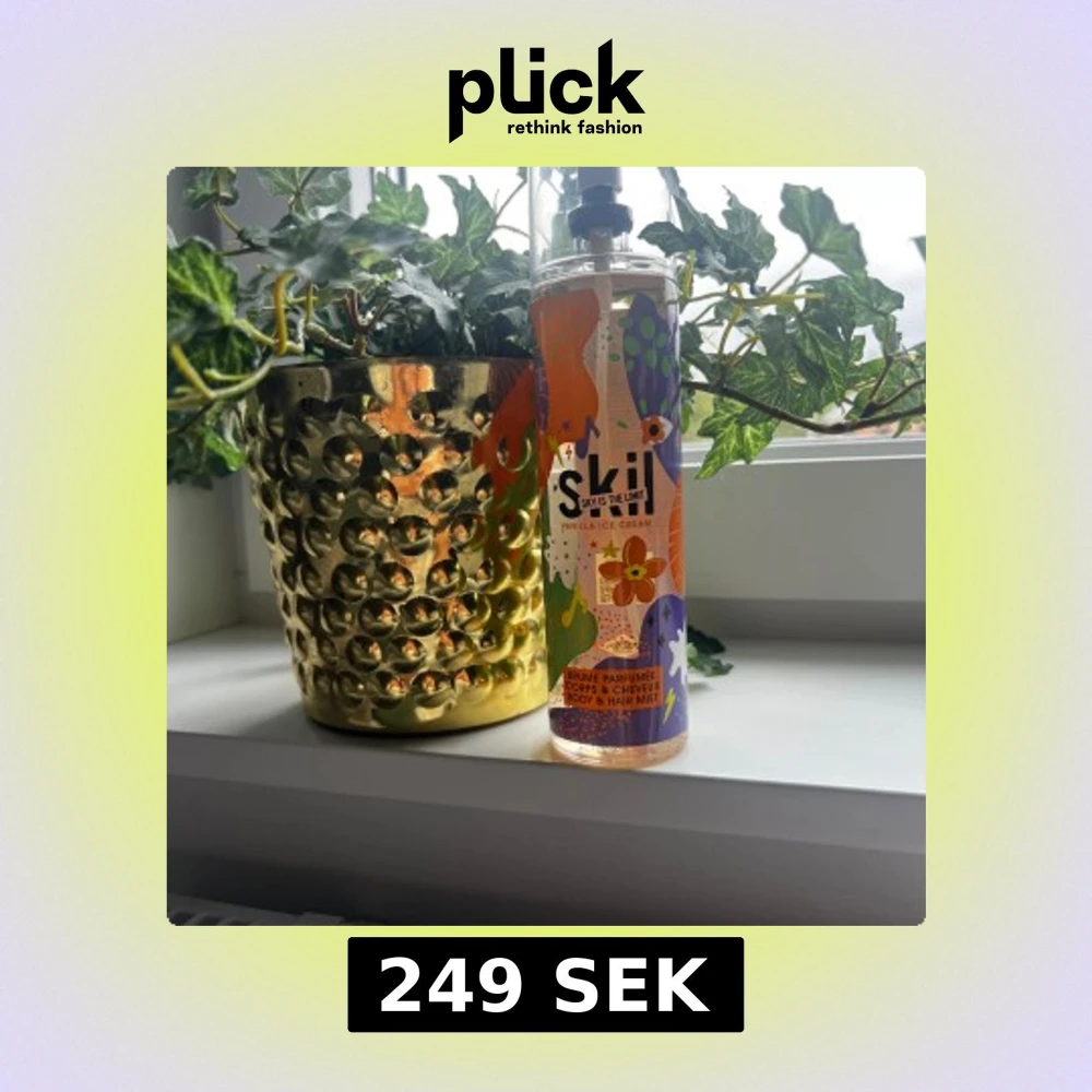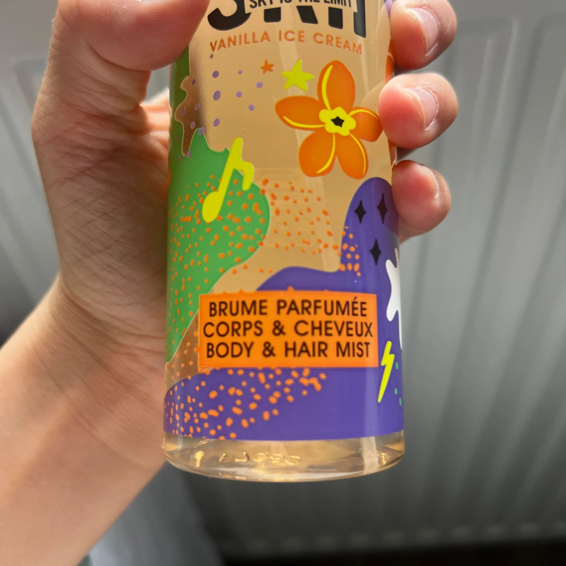 Fräsch body & hair mist från SKIL med doft av vaniljglass, karamell och mjölkiga toner. Flaskan är transparent med färgglad design i lila, orange och grönt samt blommor och stjärnor. Rymmer 250 ml och har praktisk sprayfunktion.