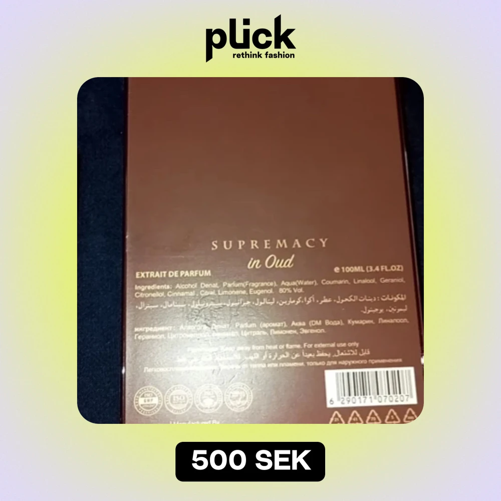 Säljer en lyxig och elegant parfym, Supremacy in Oud från Afnan. Flaskan är i en stilren brun färg med en gyllene kork och detaljer. Den innehåller 100 ml av en rik och intensiv doft med noter av oud, kanel och geraniol. Använt 10ml.