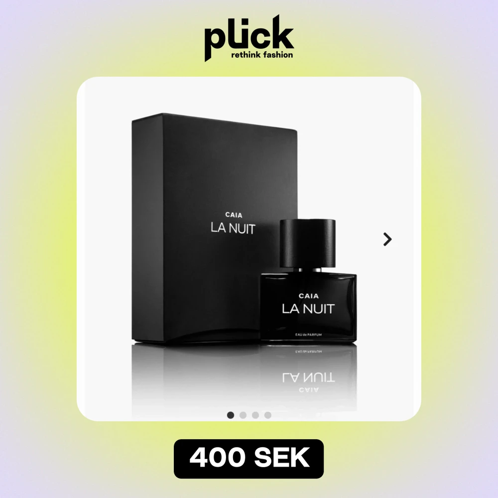 Säljer en elegant och mystisk parfym från CAIA, La Nuit. Flaskan är helsvart med en minimalistisk design och har en stilren vit text. Perfekt för kvällar när du vill känna dig extra speciell.